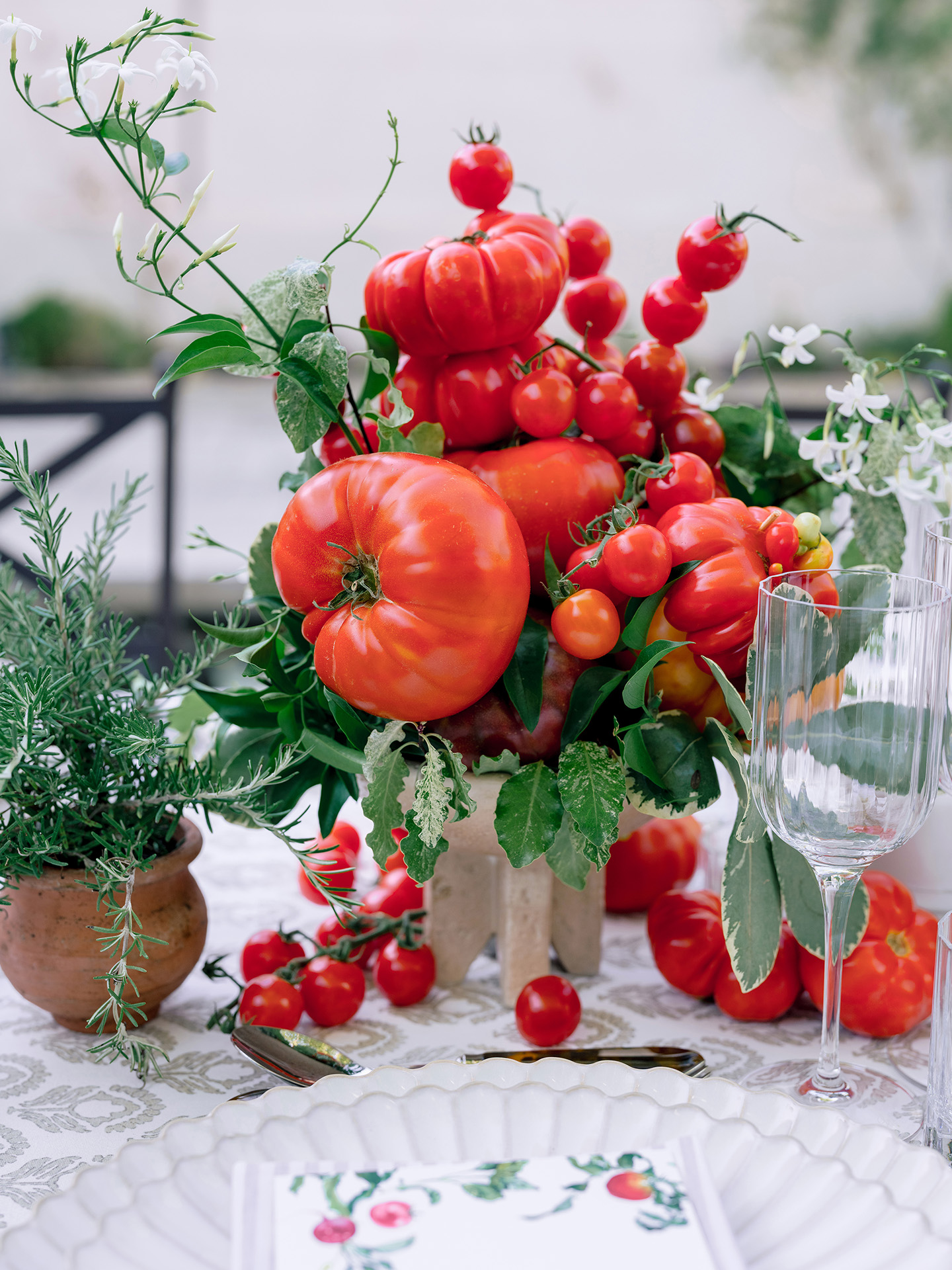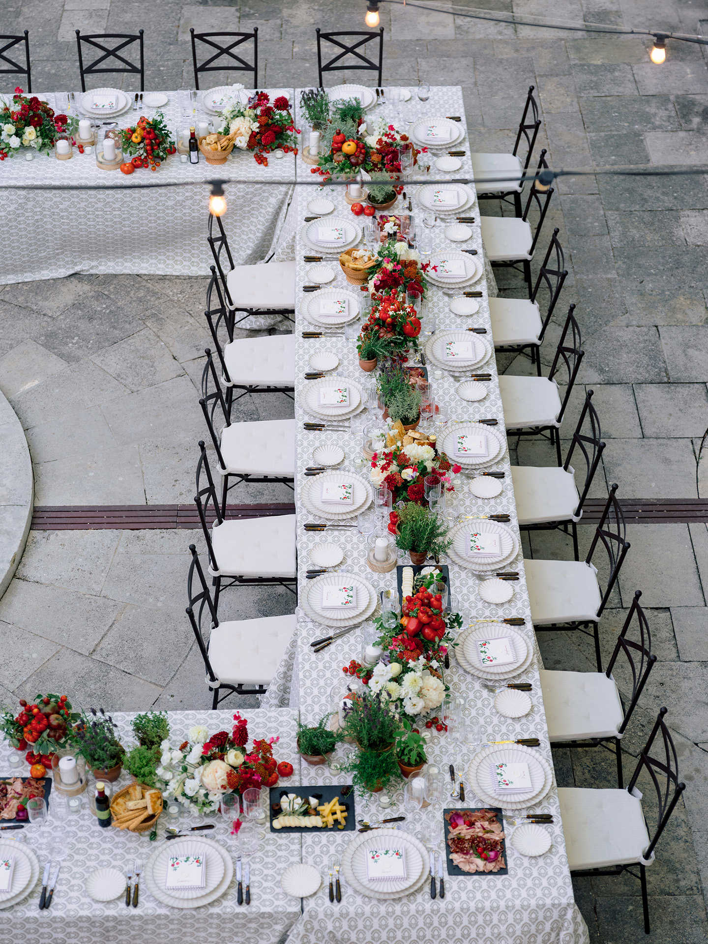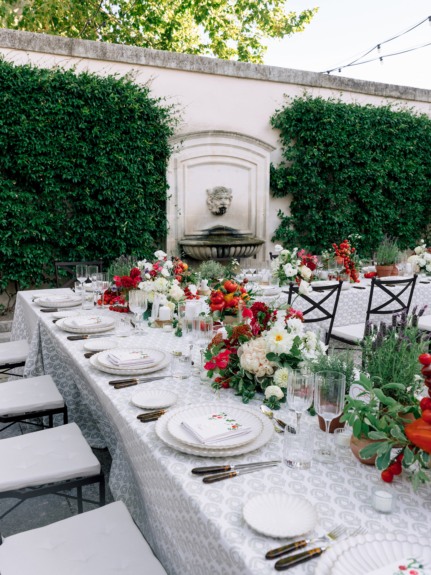 An intimate rehearsal dinner in the courtyard of Château de Tourreau combined timeless elegance with whimsical touches, from pops of red flowers and potted herbs to towers of vine-ripened tomatoes. Against a neutral backdrop, guests shared heartfelt toasts, creating a magical and memorable prelude to the wedding celebration the next day.