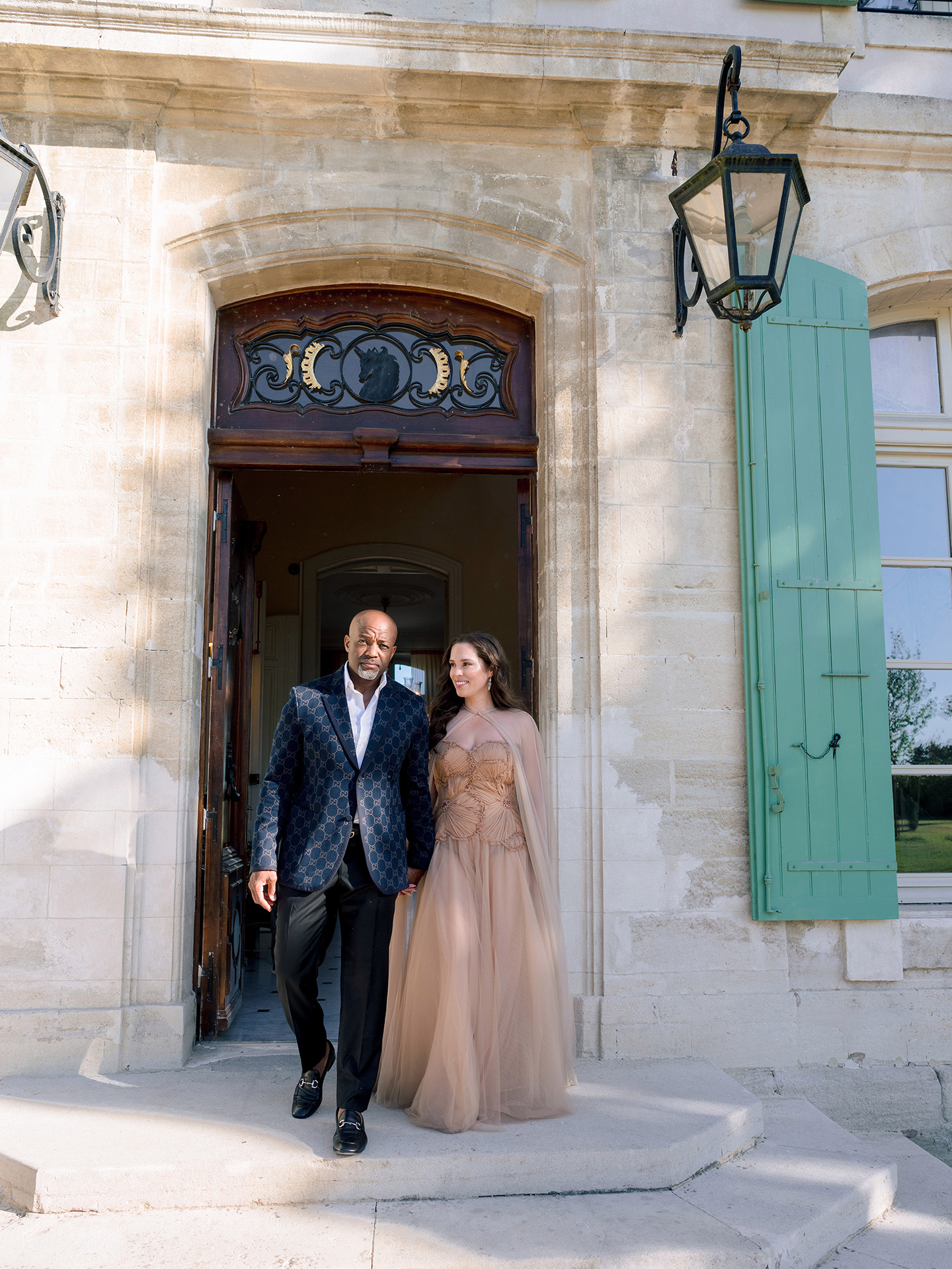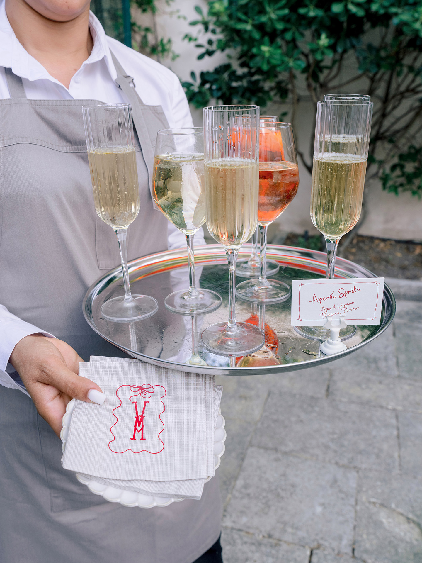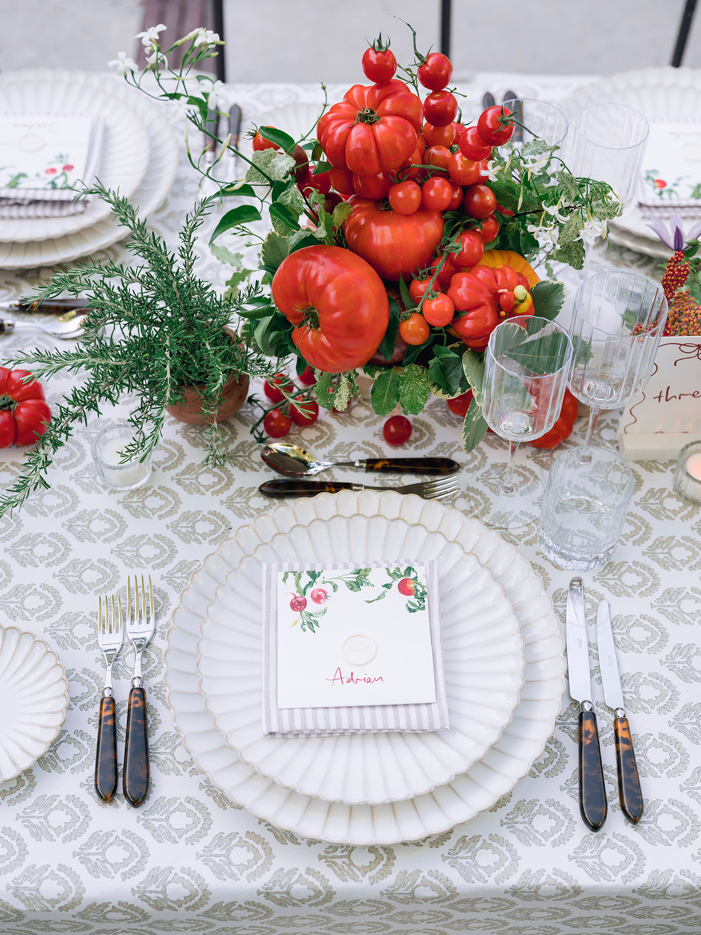 An intimate rehearsal dinner in the courtyard of Château de Tourreau combined timeless elegance with whimsical touches, from pops of red flowers and potted herbs to towers of vine-ripened tomatoes. Against a neutral backdrop, guests shared heartfelt toasts, creating a magical and memorable prelude to the wedding celebration the next day.