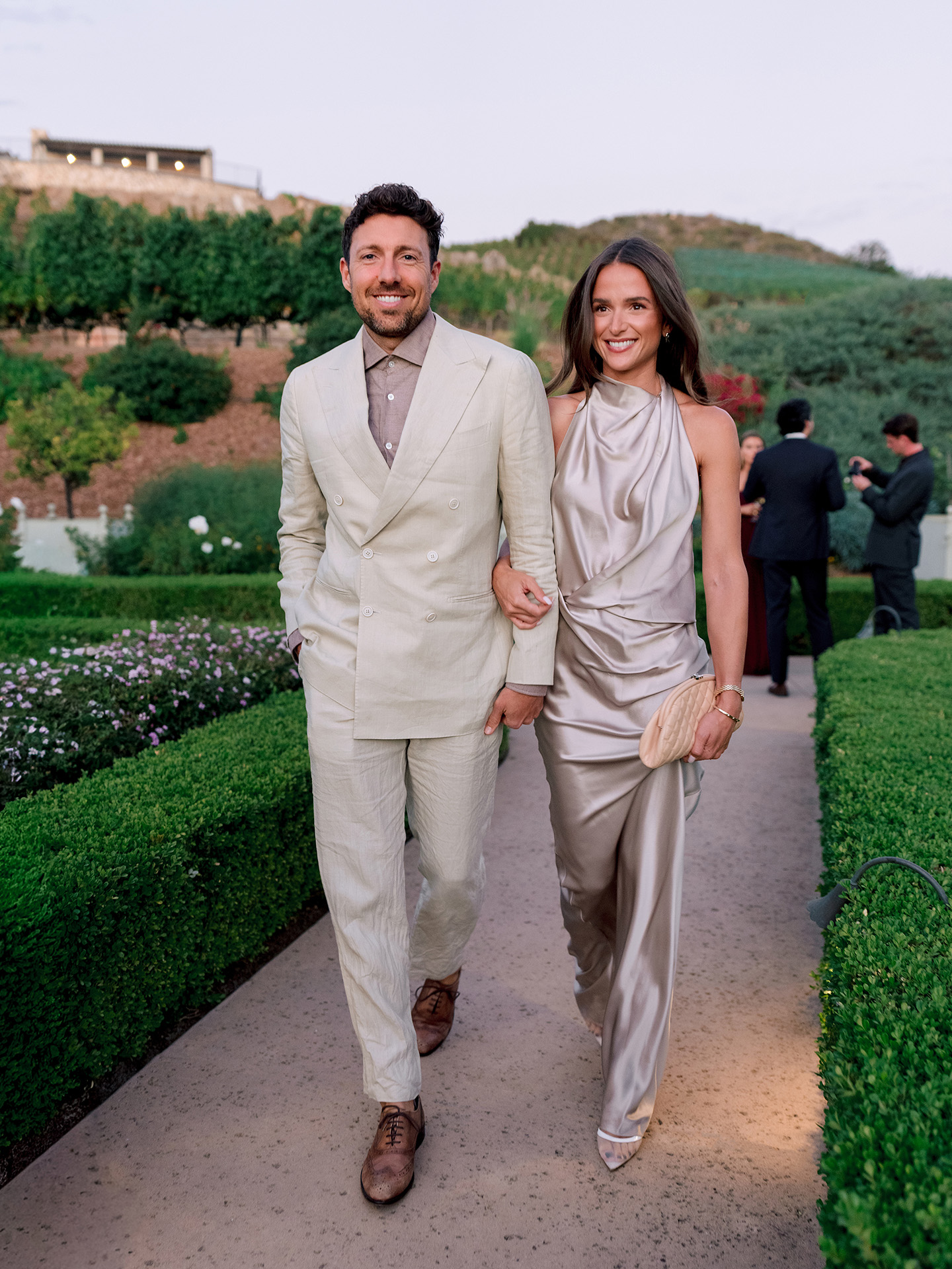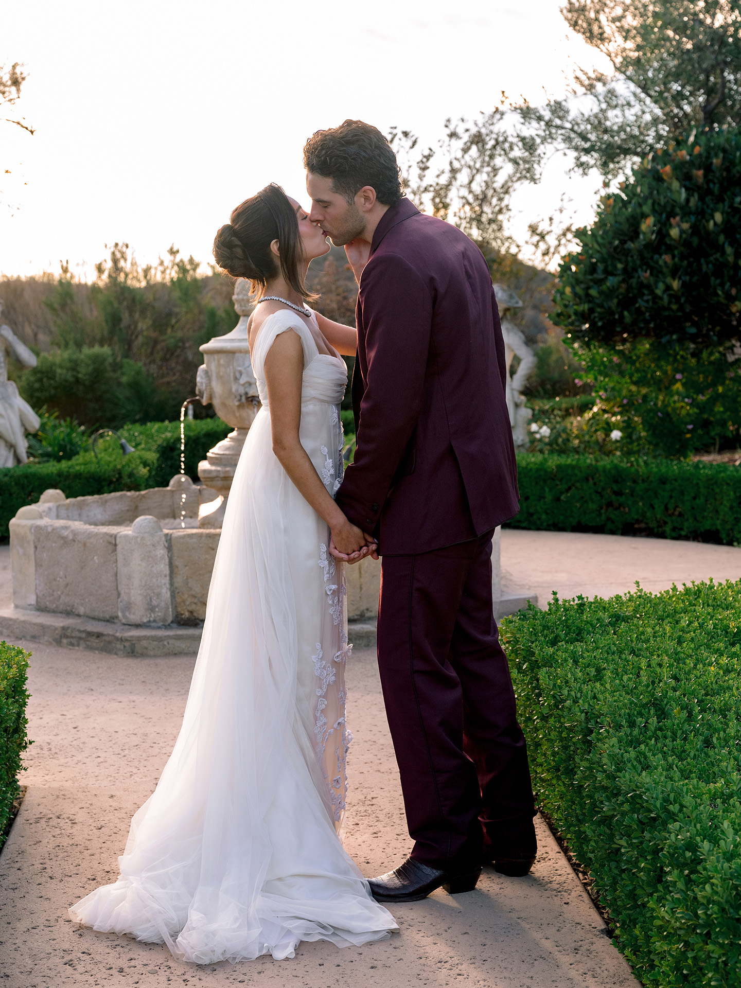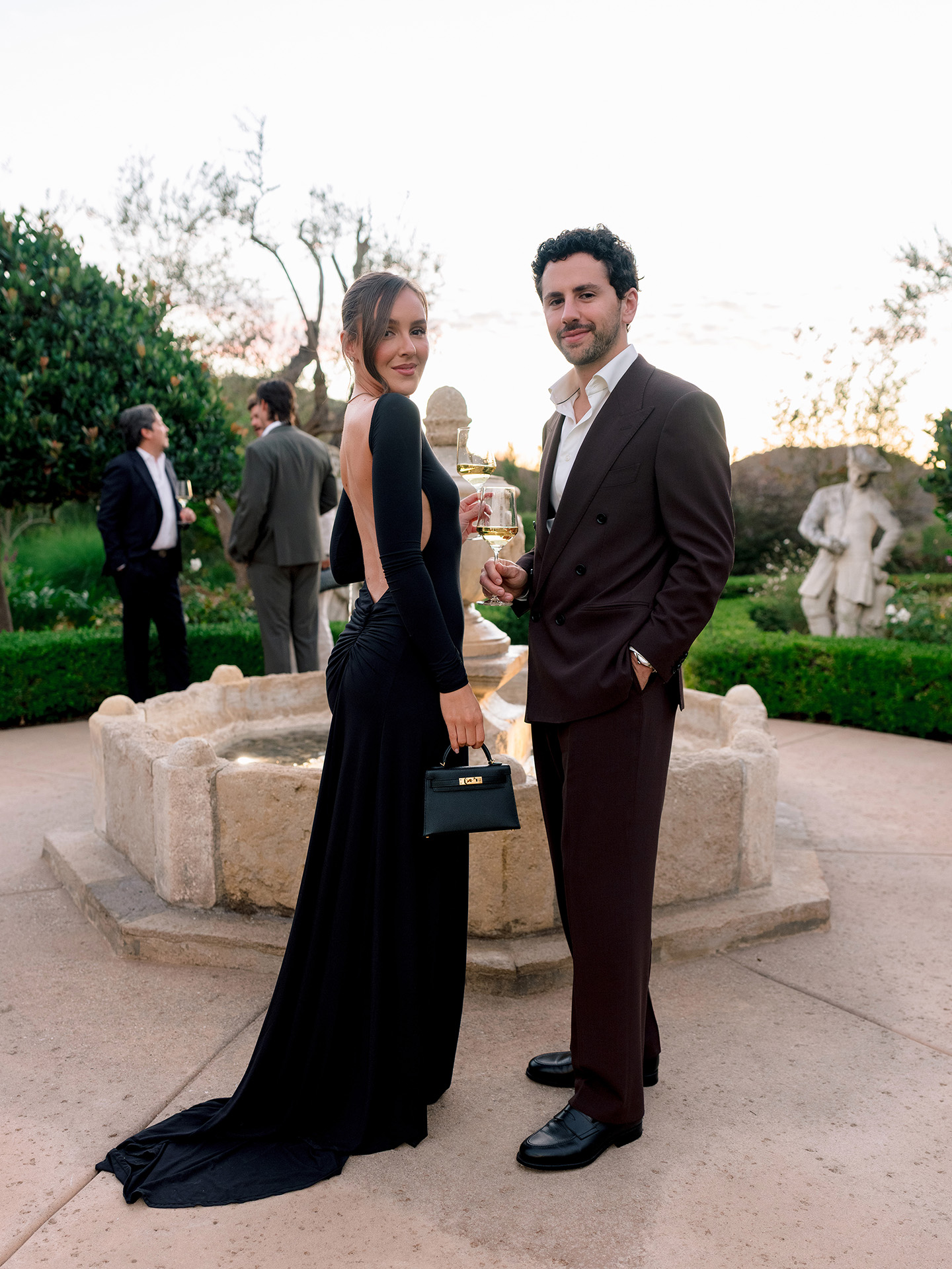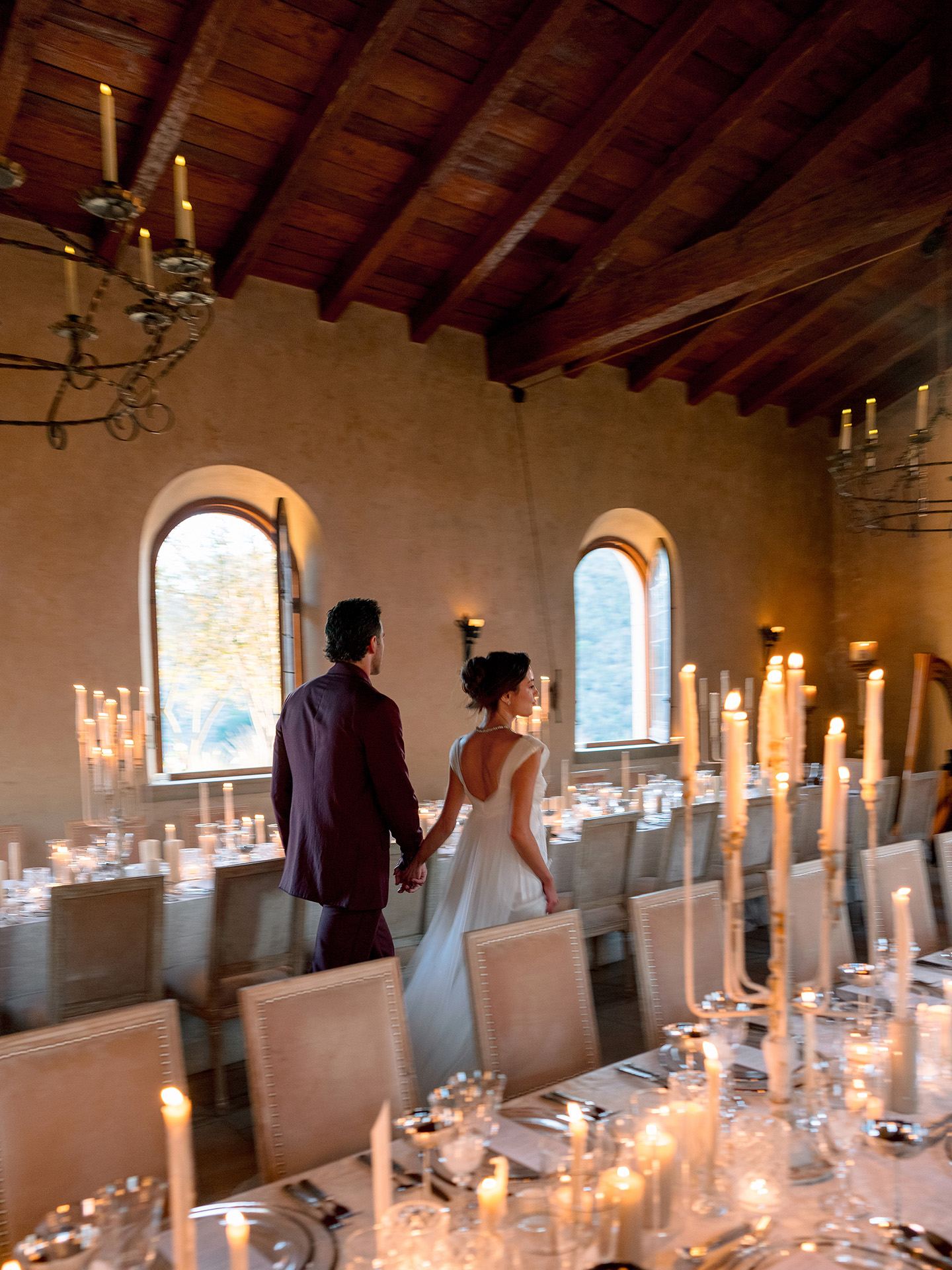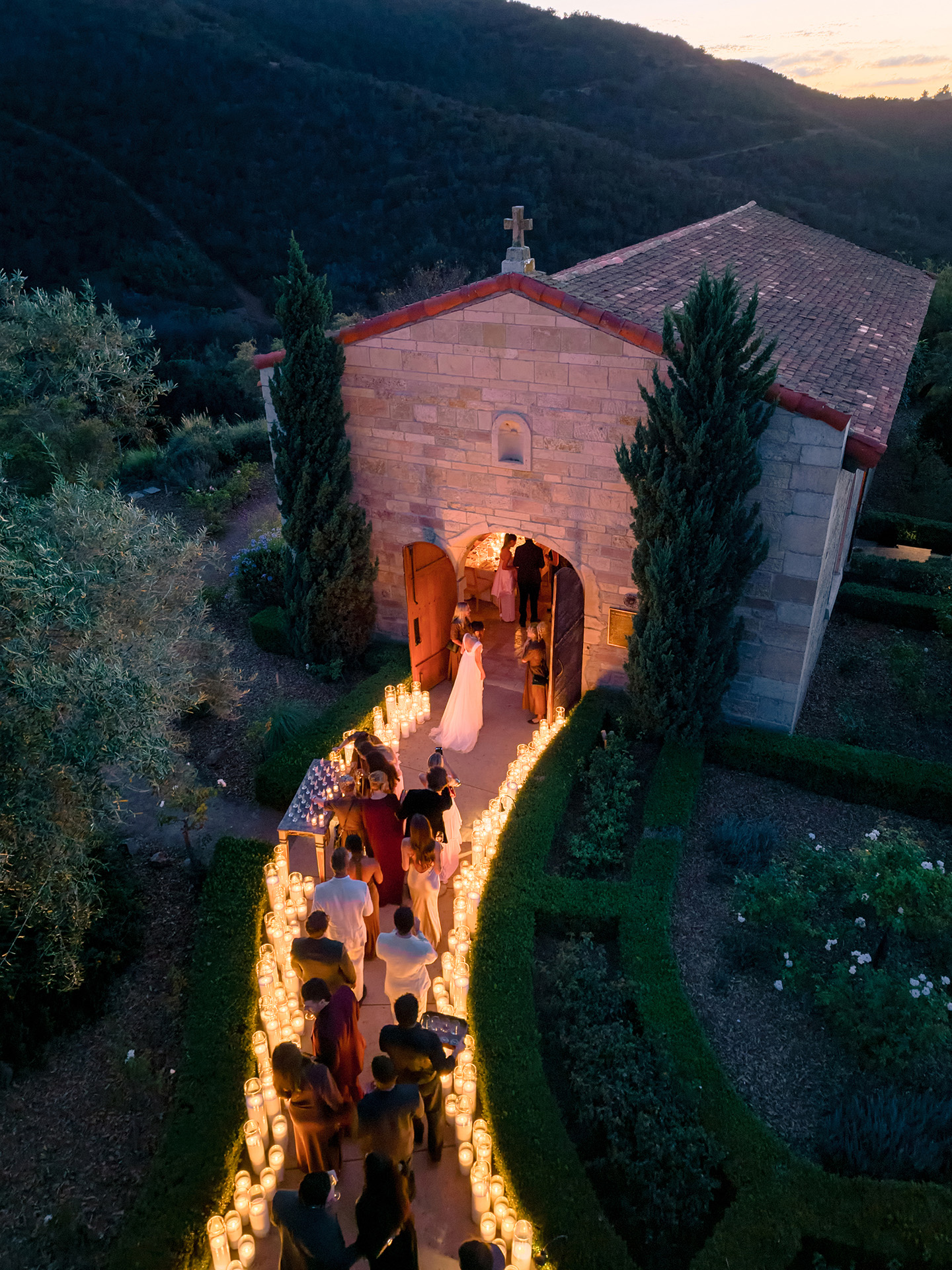 The kickoff to a French-inspired wedding weekend at Cal-a-Vie welcomed guests with sunset drinks in the chapel gardens, followed by a magical, minimalist yet old-world–inspired candlelit dinner inside the chapel. A French harp serenade complemented the romantic atmosphere, while guests in merlot, blush, and brown added dramatic pops against a serene neutral palette.