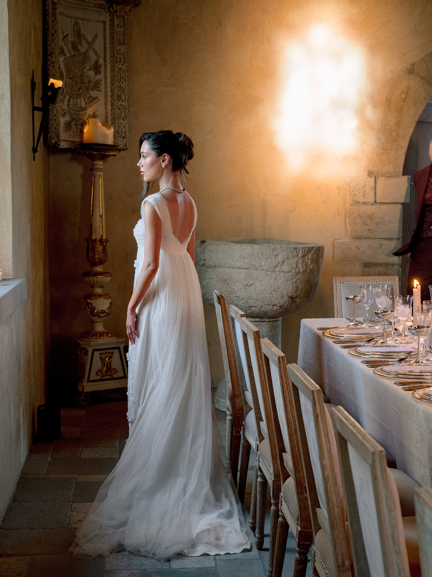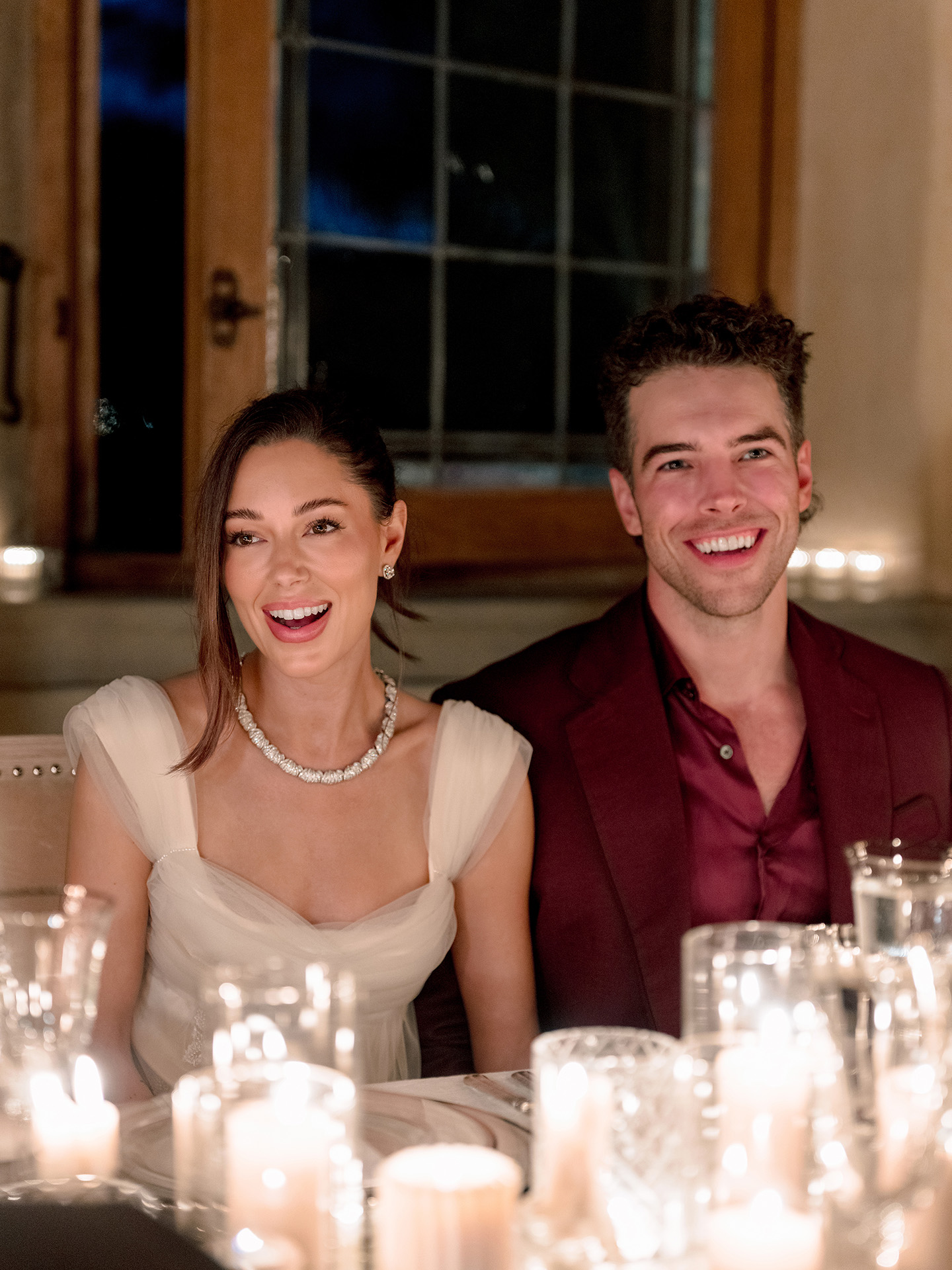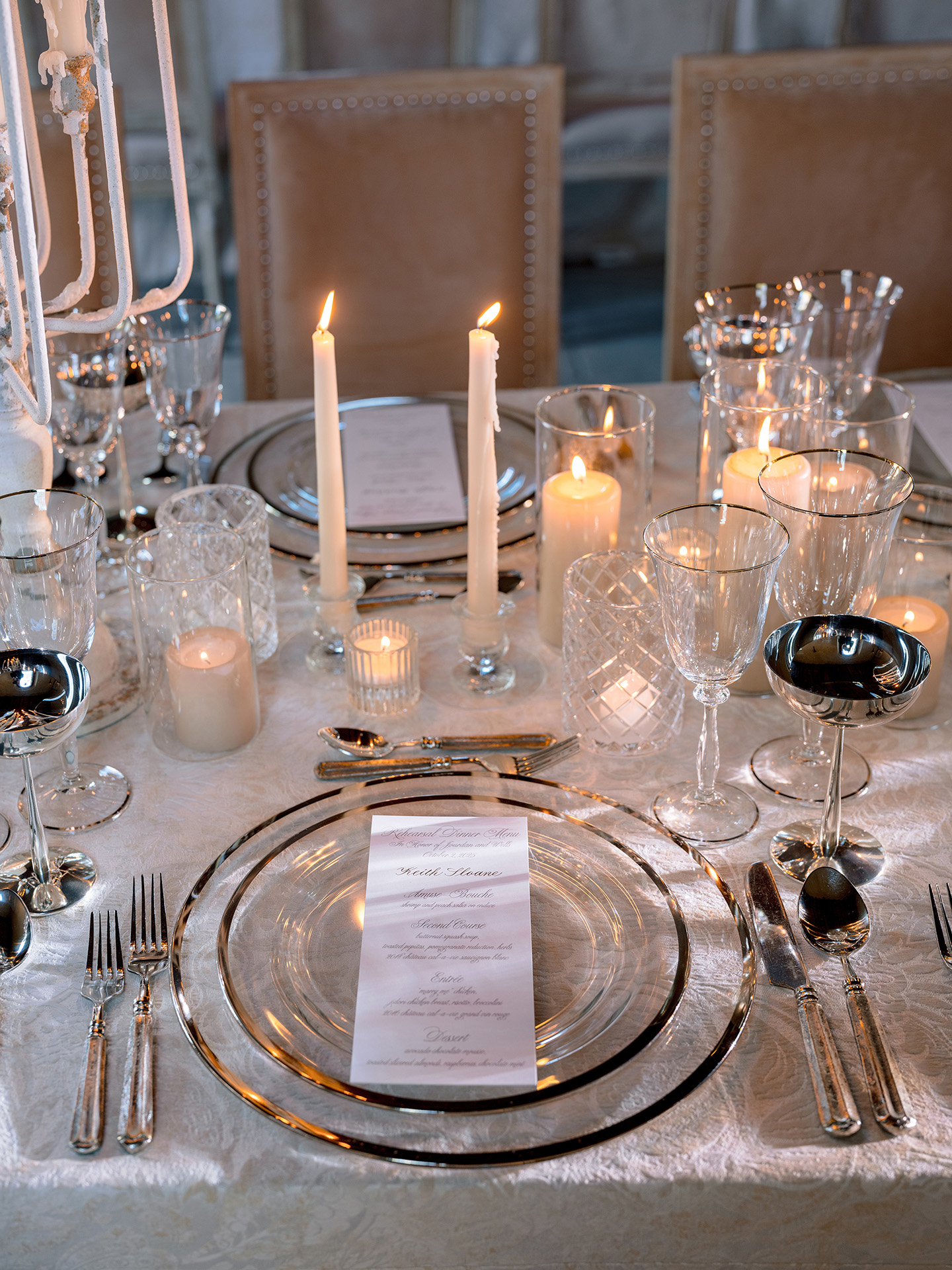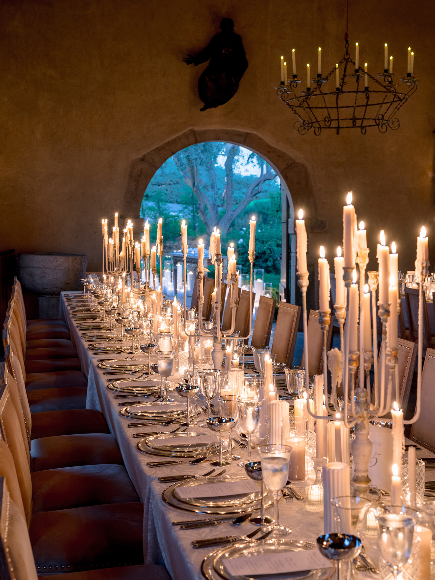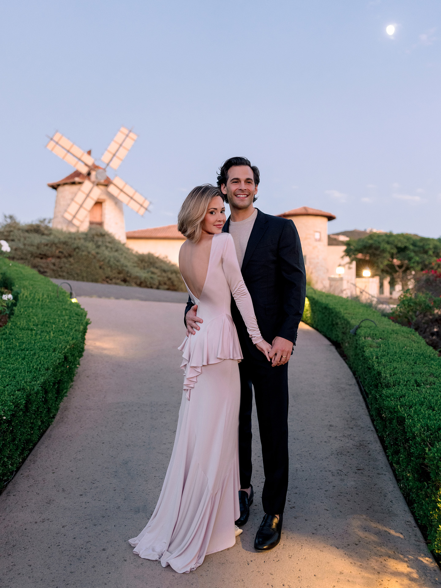 The kickoff to a French-inspired wedding weekend at Cal-a-Vie welcomed guests with sunset drinks in the chapel gardens, followed by a magical, minimalist yet old-world–inspired candlelit dinner inside the chapel. A French harp serenade complemented the romantic atmosphere, while guests in merlot, blush, and brown added dramatic pops against a serene neutral palette.