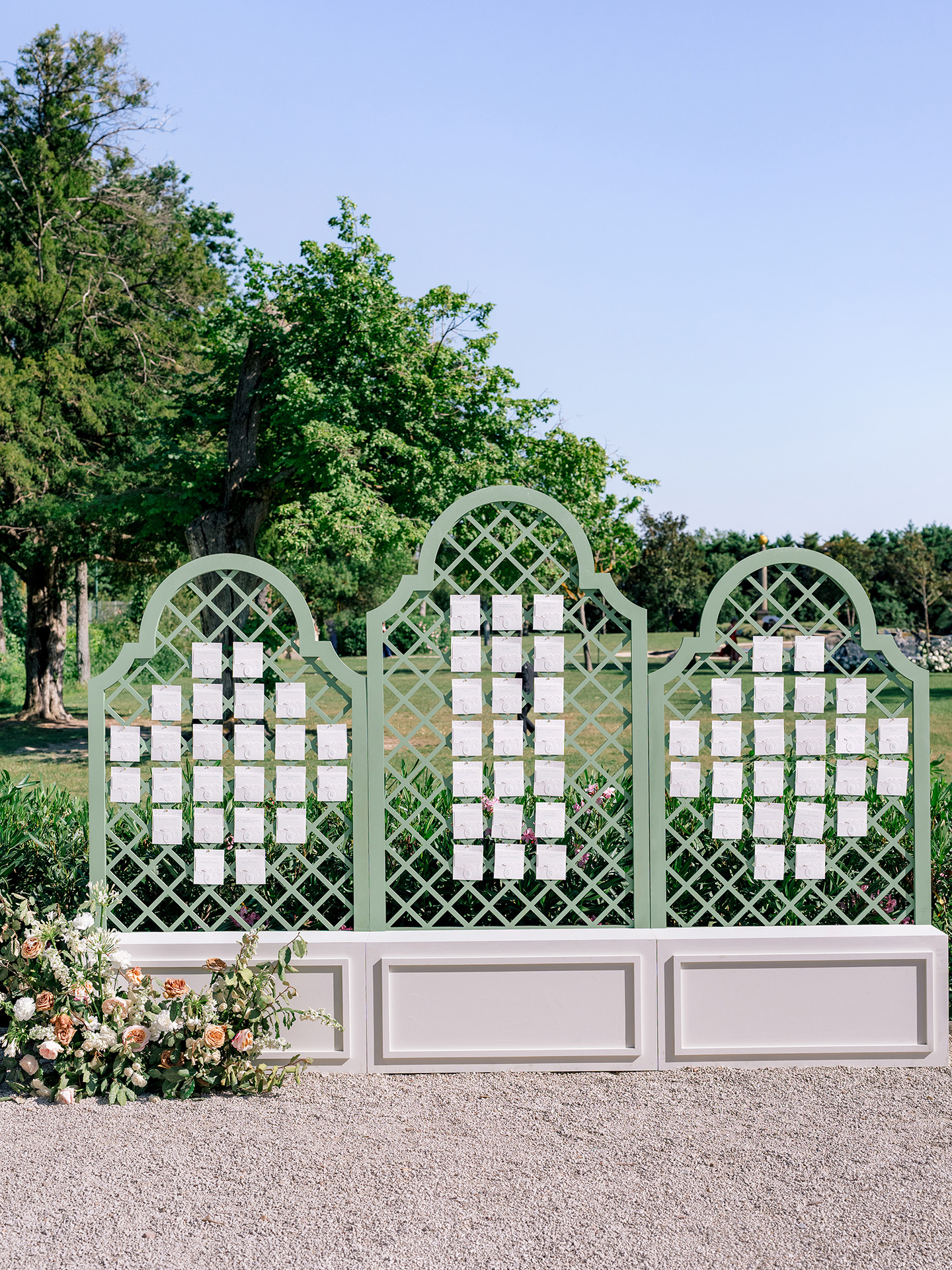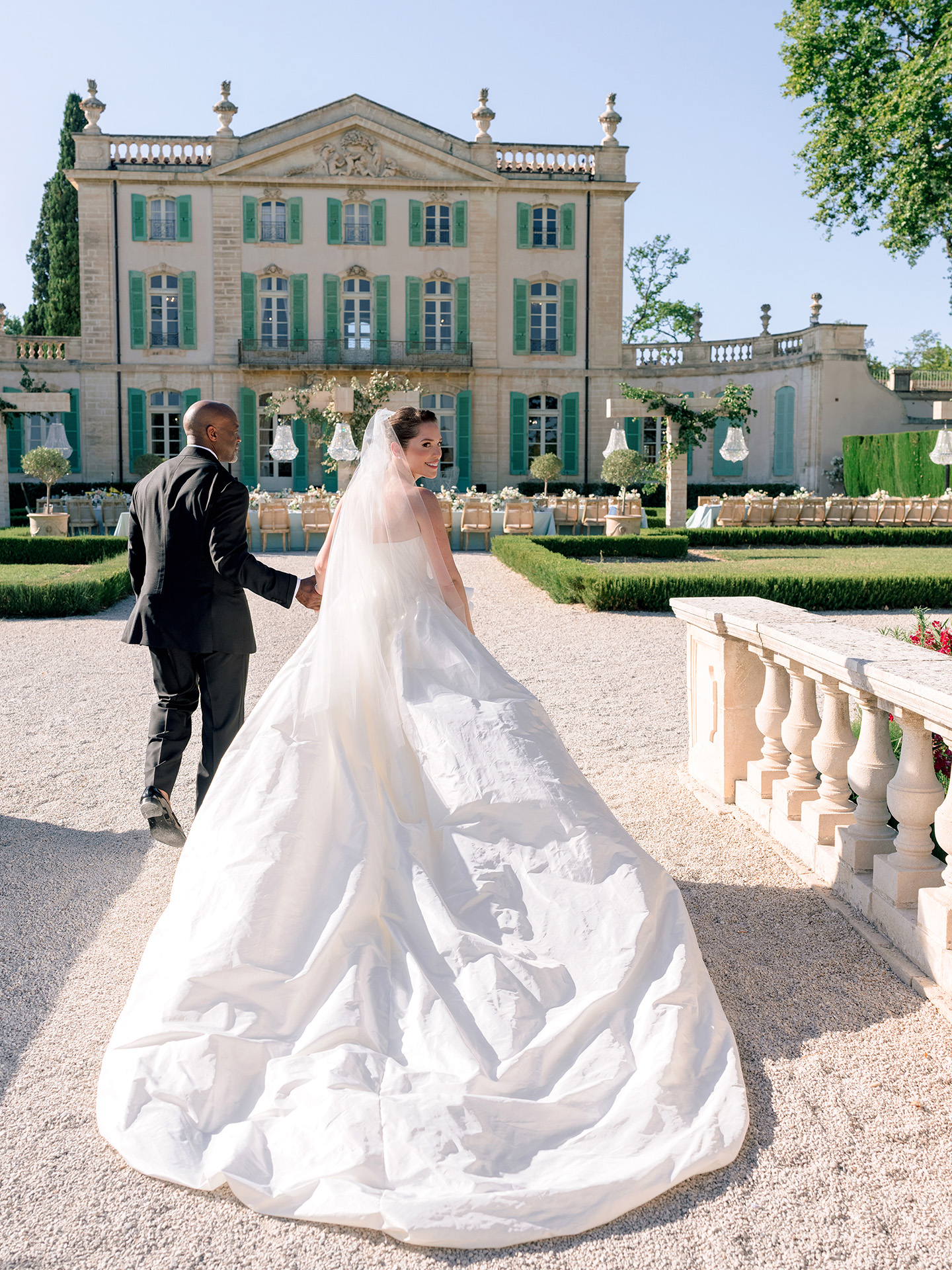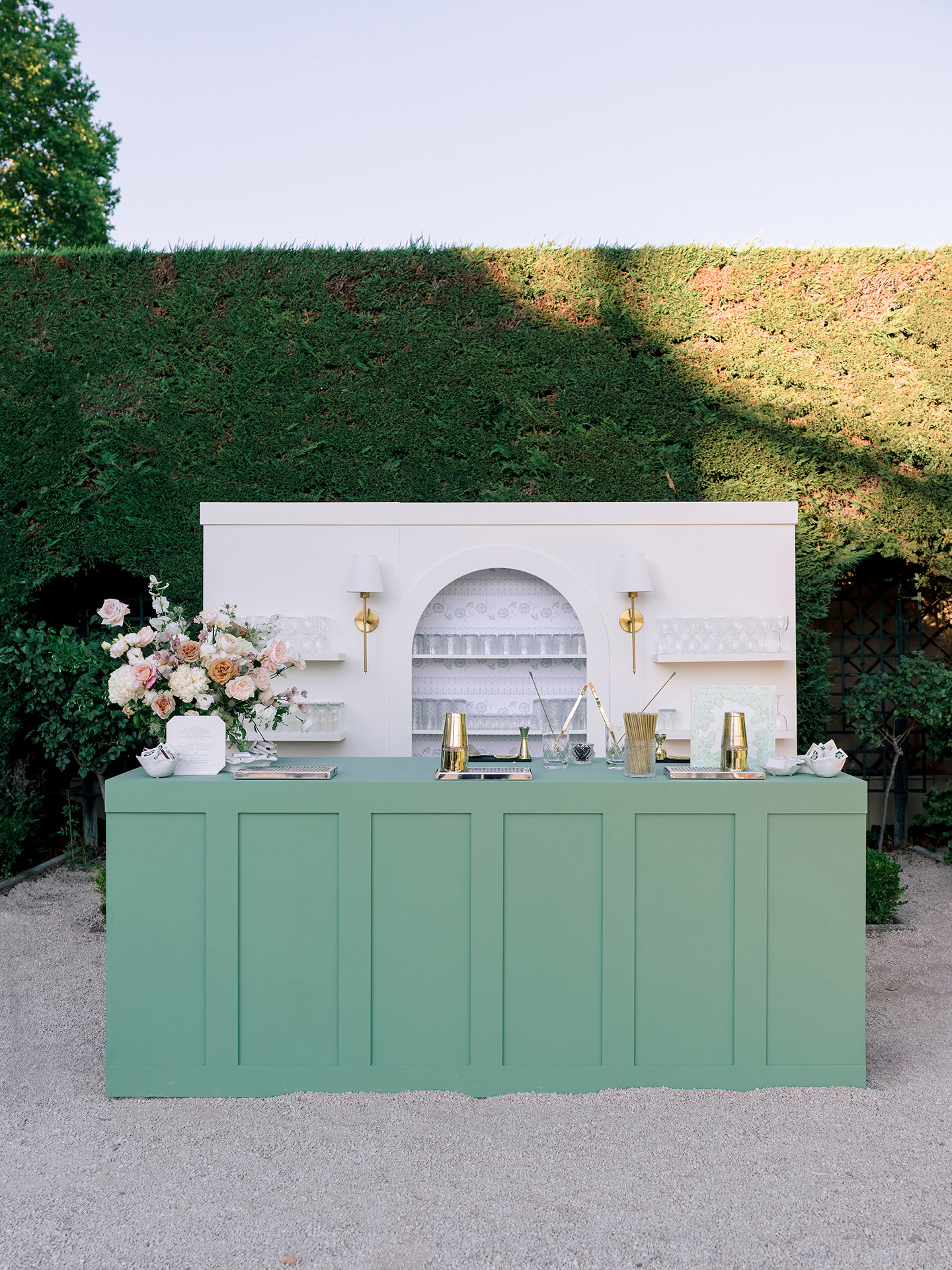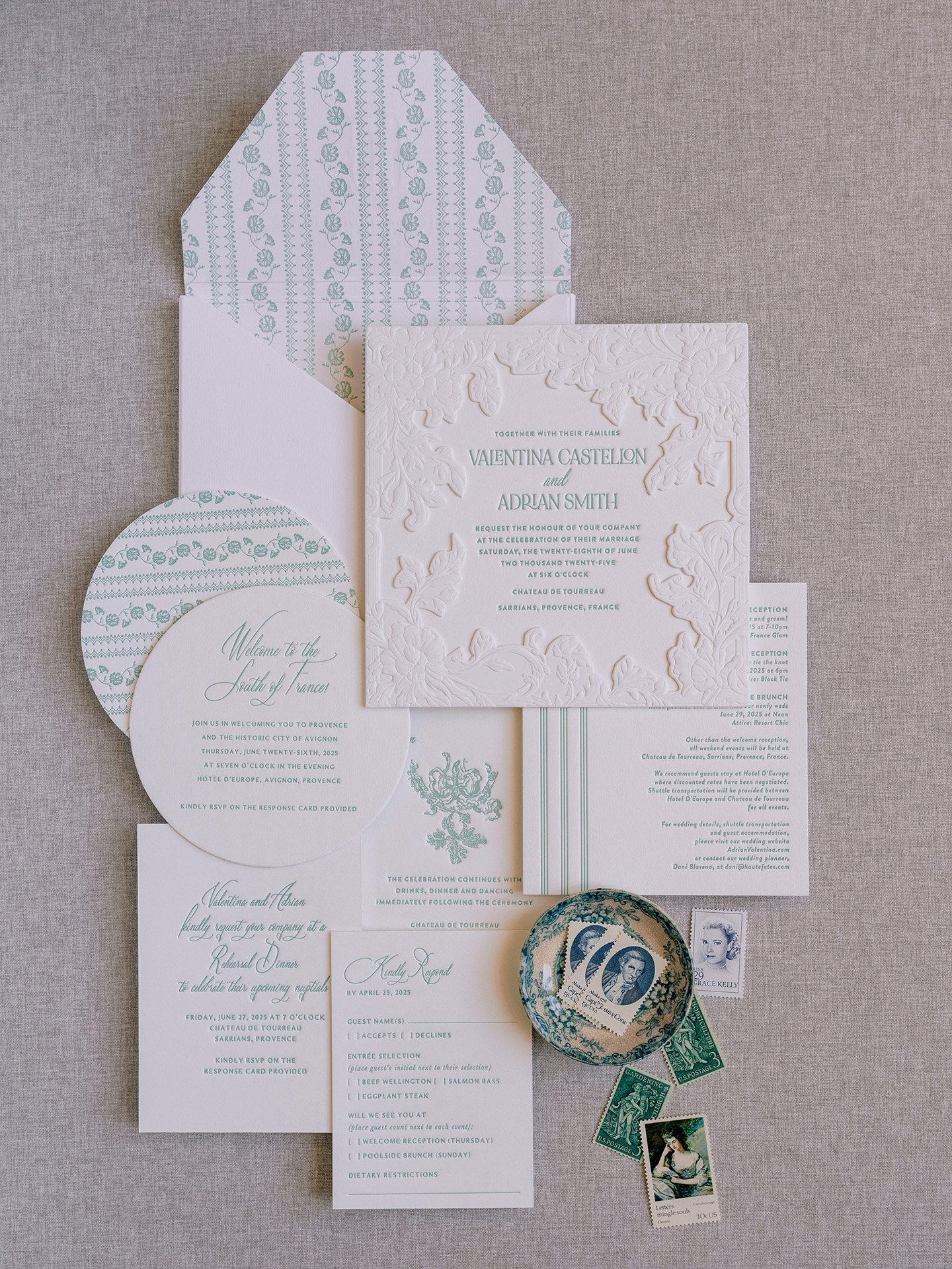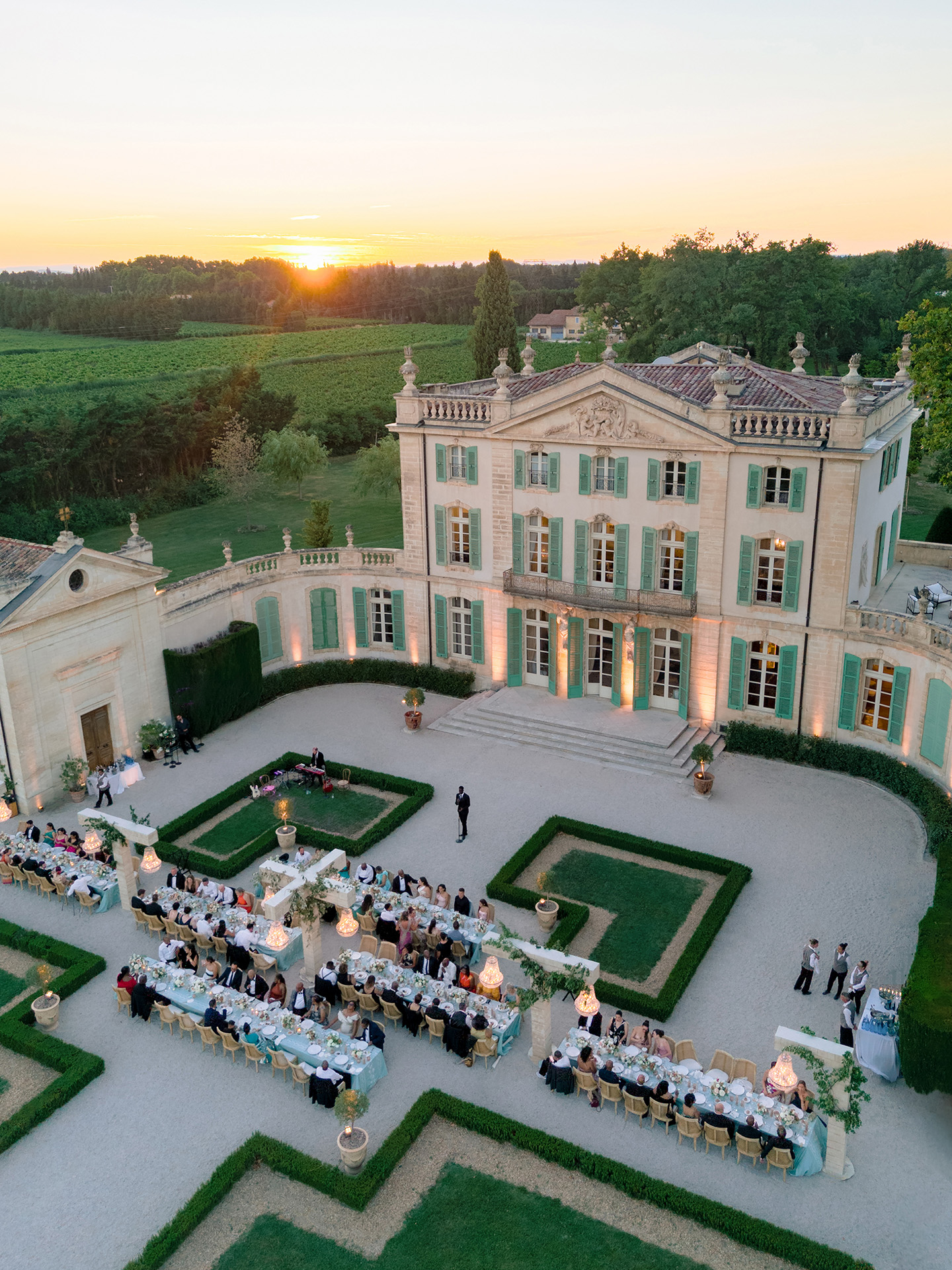 An elegant garden wedding at a stunning château embraced a timeless palette of pale green, white, and terracotta, inspired by the chateau’s shutters. Guests dined under candlelight and old-world candelabras seamlessly integrated into the architecture before a fireworks-lit crescendo led to an unforgettable dance party, complete with late-night pizza served from personalized boxes.