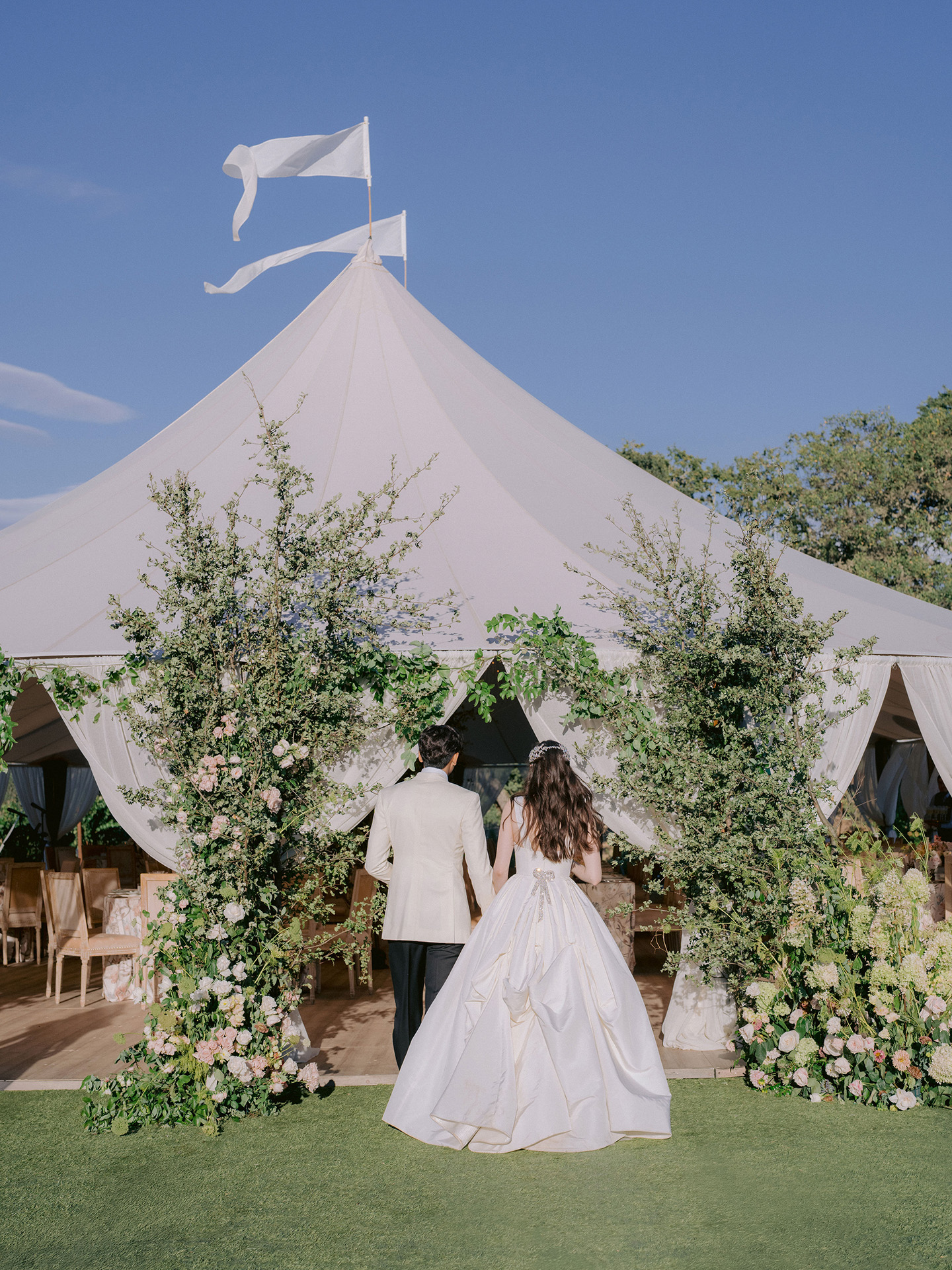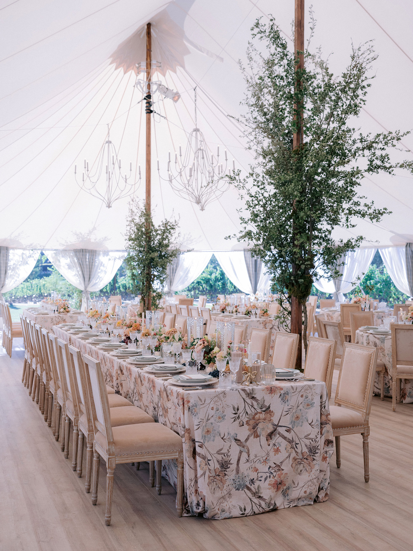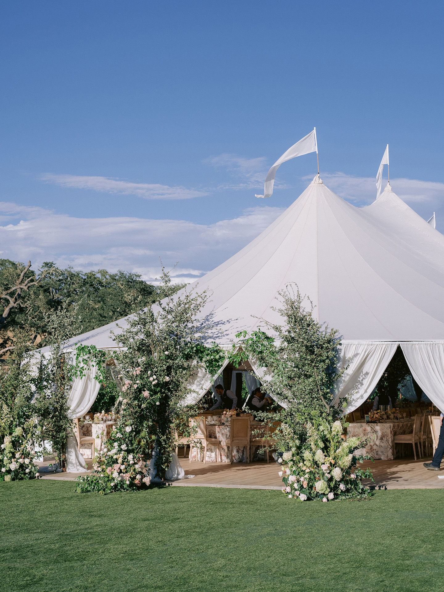 A romantic tented wedding at the Montage Healdsburg embraced timeless elegance with floral prints and a muted color palette of terracotta, rose, olive, seafoam, and merlot, reflecting the natural beauty of the surrounding vineyards and hills. Guests celebrated under billowing plaid-lined tent drapes before an energetic Chinese Speakeasy after-party, complete with red and black décor, dragon-inspired dance floor, and playful touches like popcorn in takeout boxes.