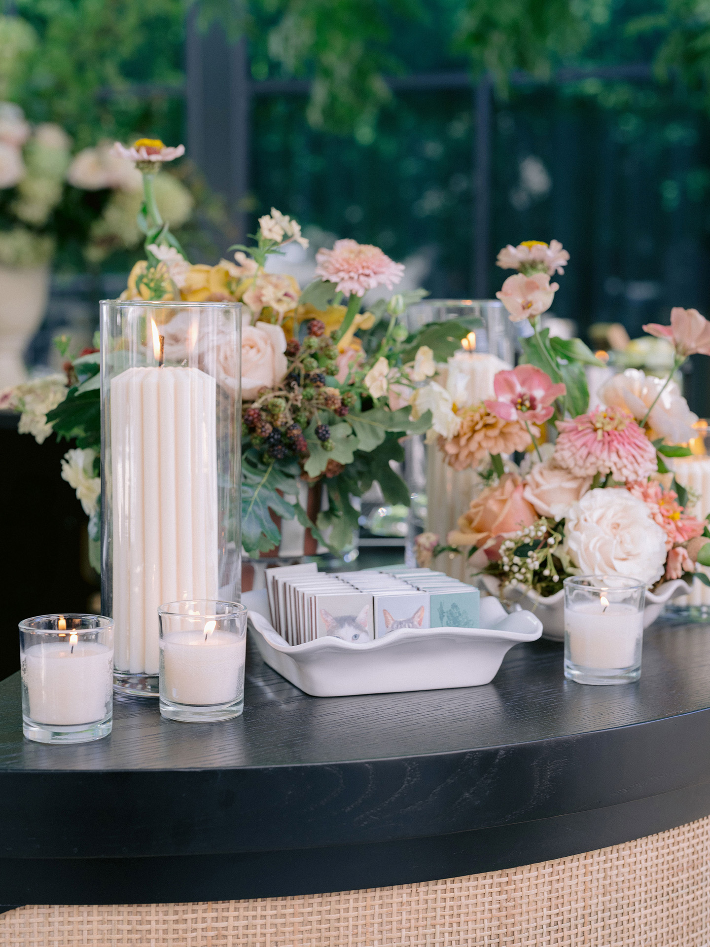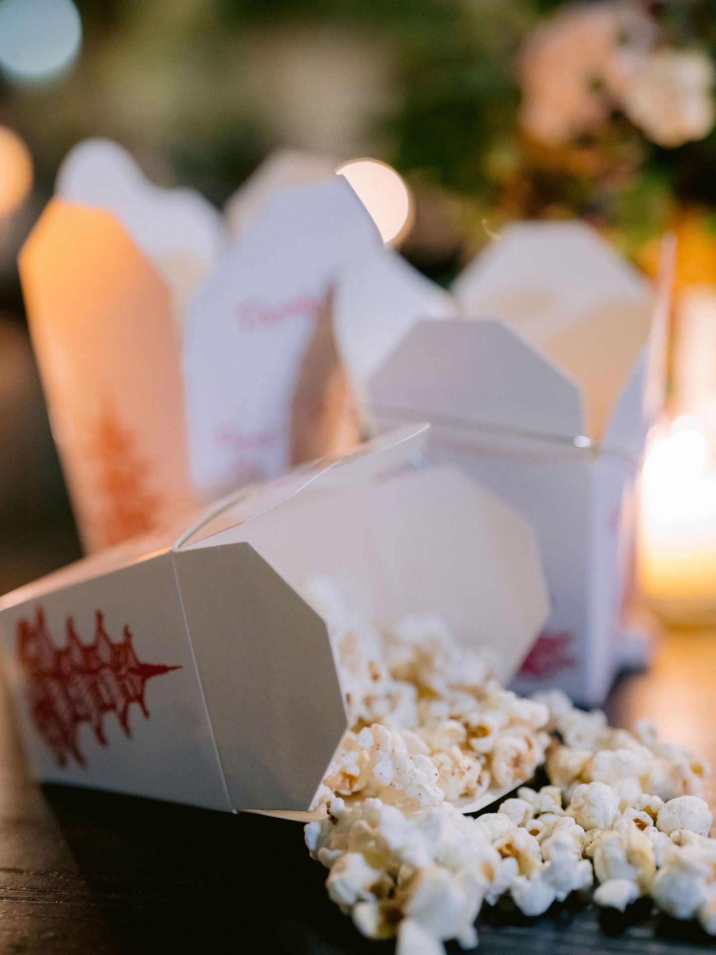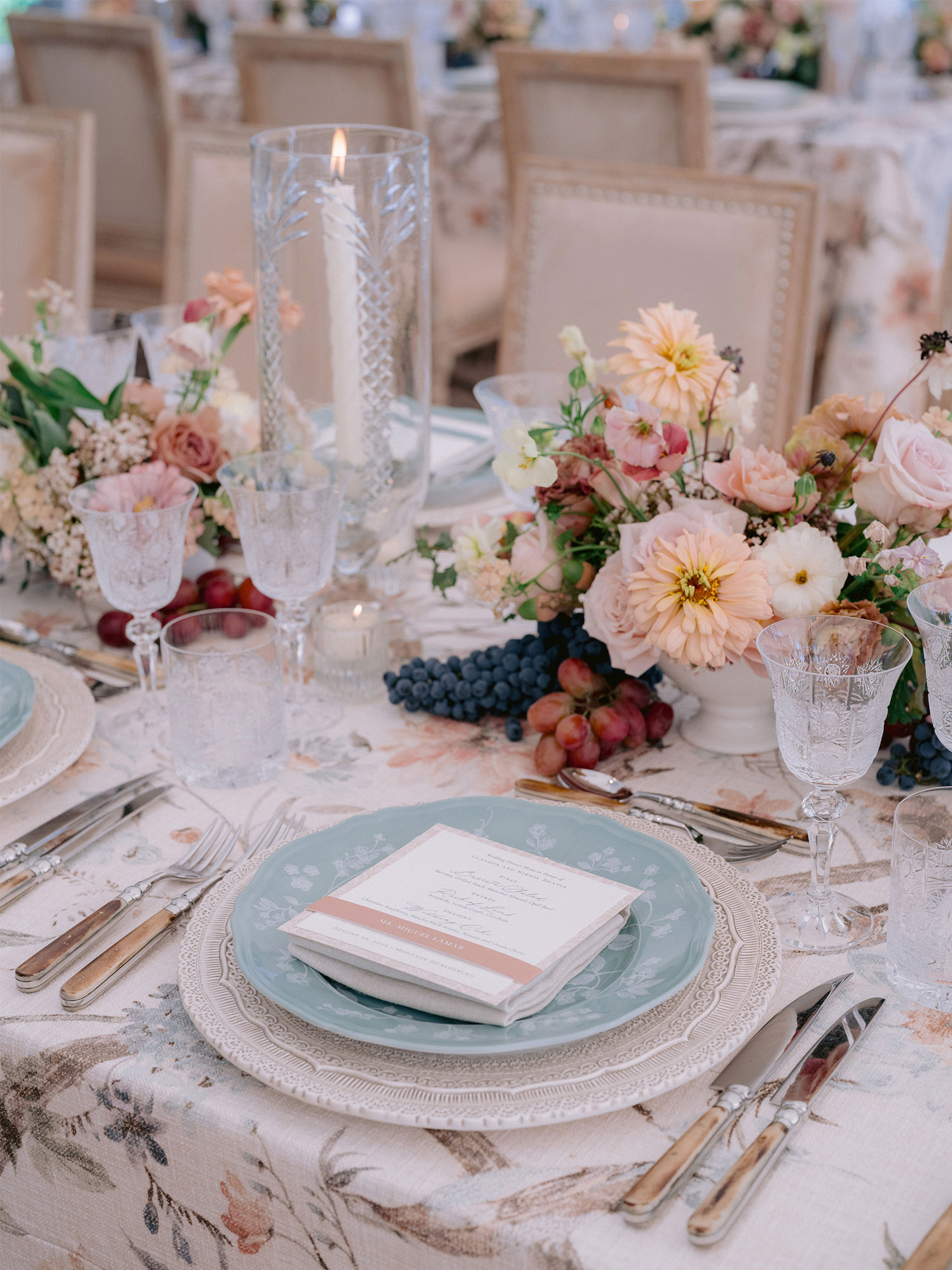 A romantic tented wedding at the Montage Healdsburg embraced timeless elegance with floral prints and a muted color palette of terracotta, rose, olive, seafoam, and merlot, reflecting the natural beauty of the surrounding vineyards and hills. Guests celebrated under billowing plaid-lined tent drapes before an energetic Chinese Speakeasy after-party, complete with red and black décor, dragon-inspired dance floor, and playful touches like popcorn in takeout boxes.