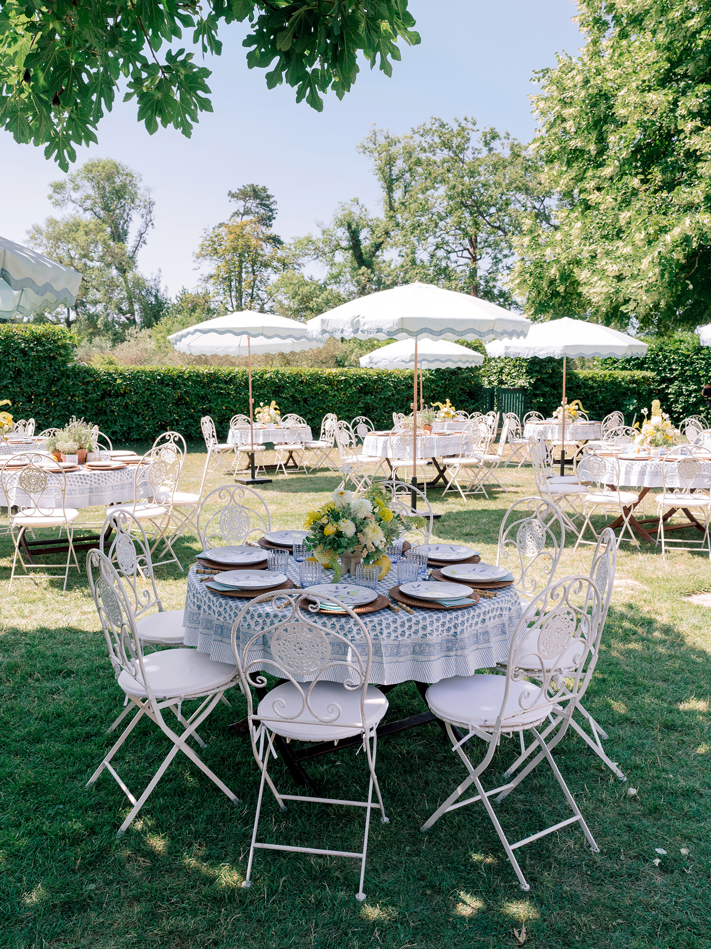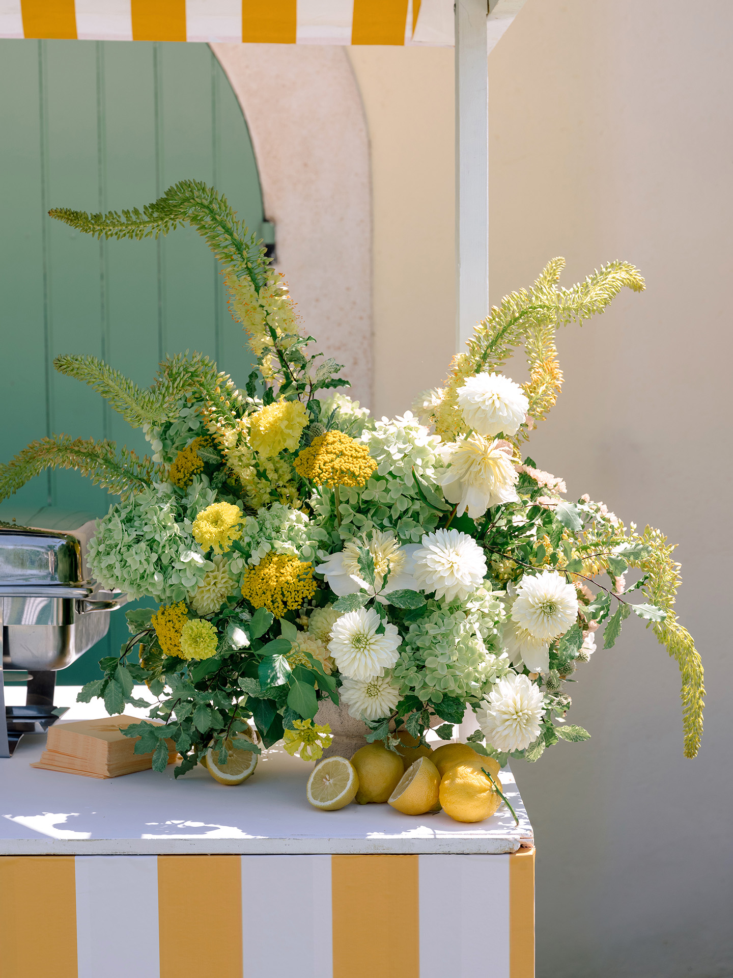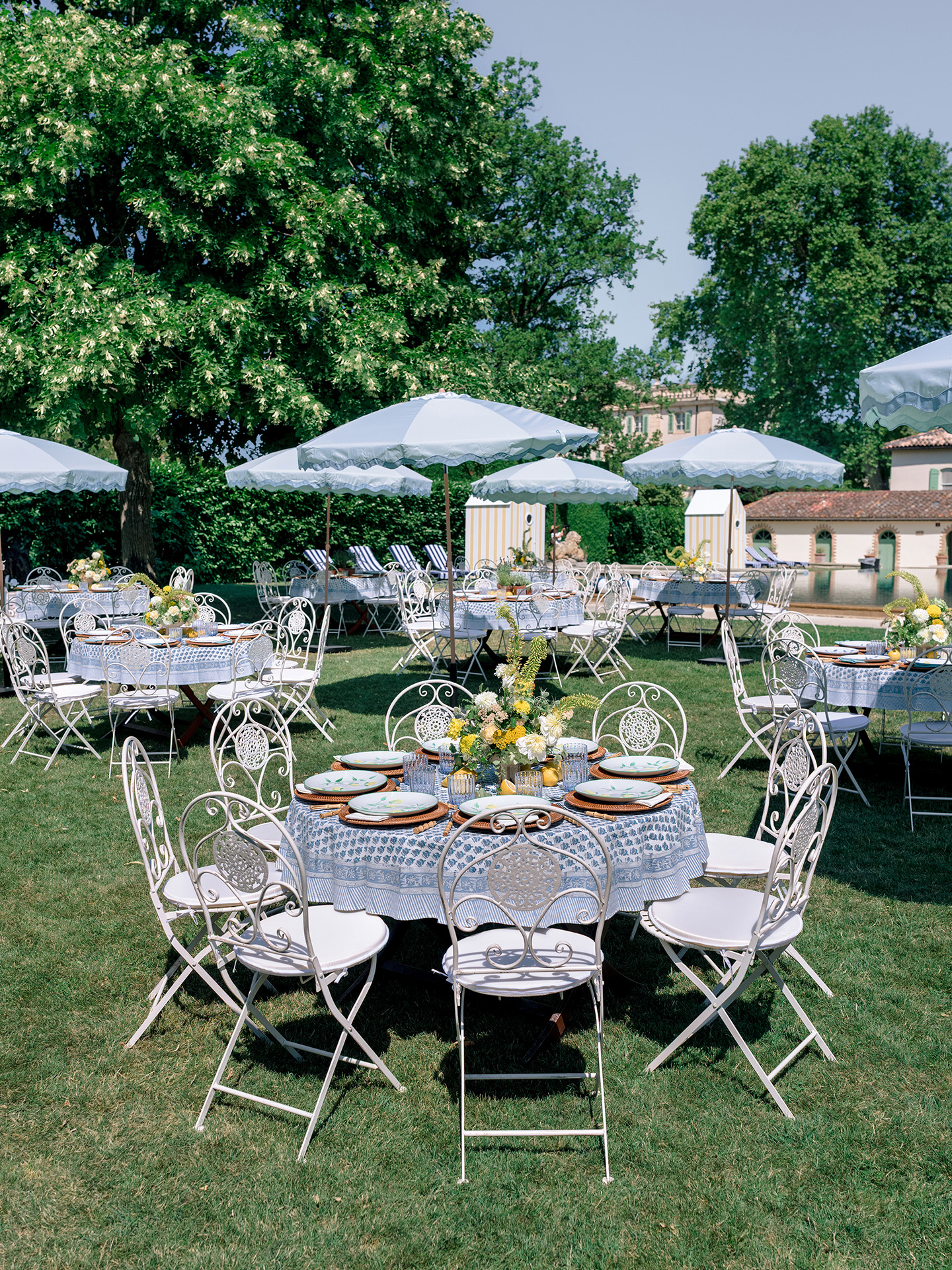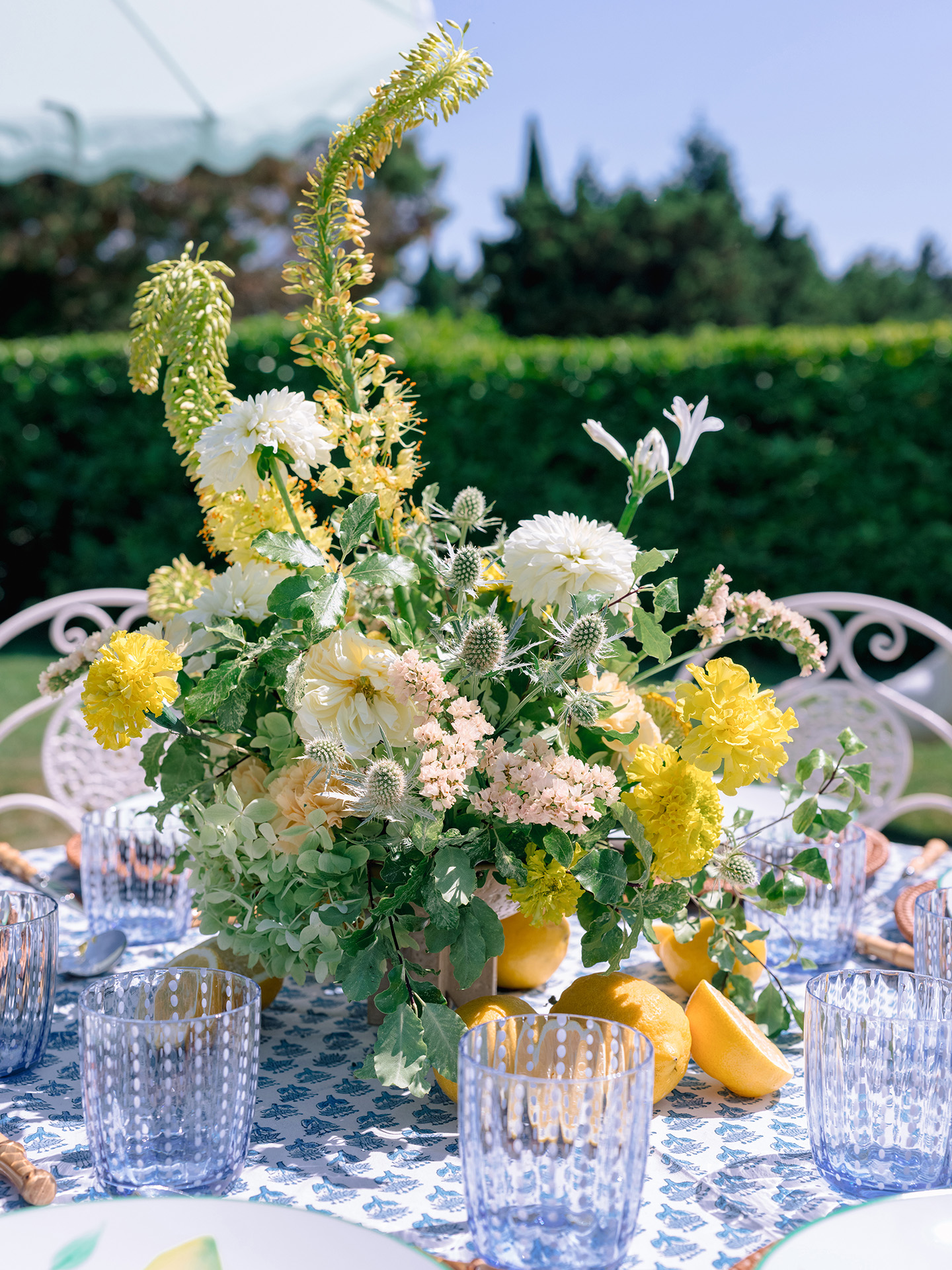 The farewell brunch of a four-day wedding weekend brought guests together poolside for a relaxed, sun-drenched celebration. Frozen Aperol spritzes, lemony touches throughout, pretty blue block print linens, and pops of yellow, green, and white florals created a vibrant and refreshing finale to a truly magical weekend.