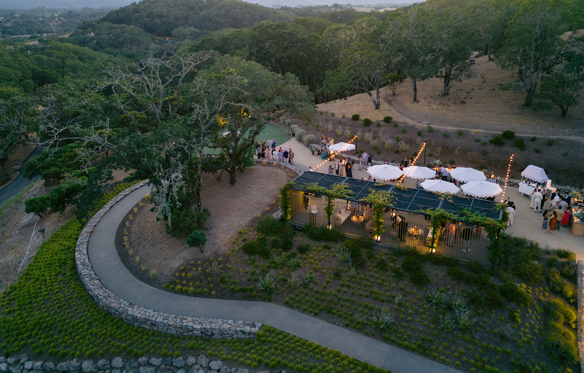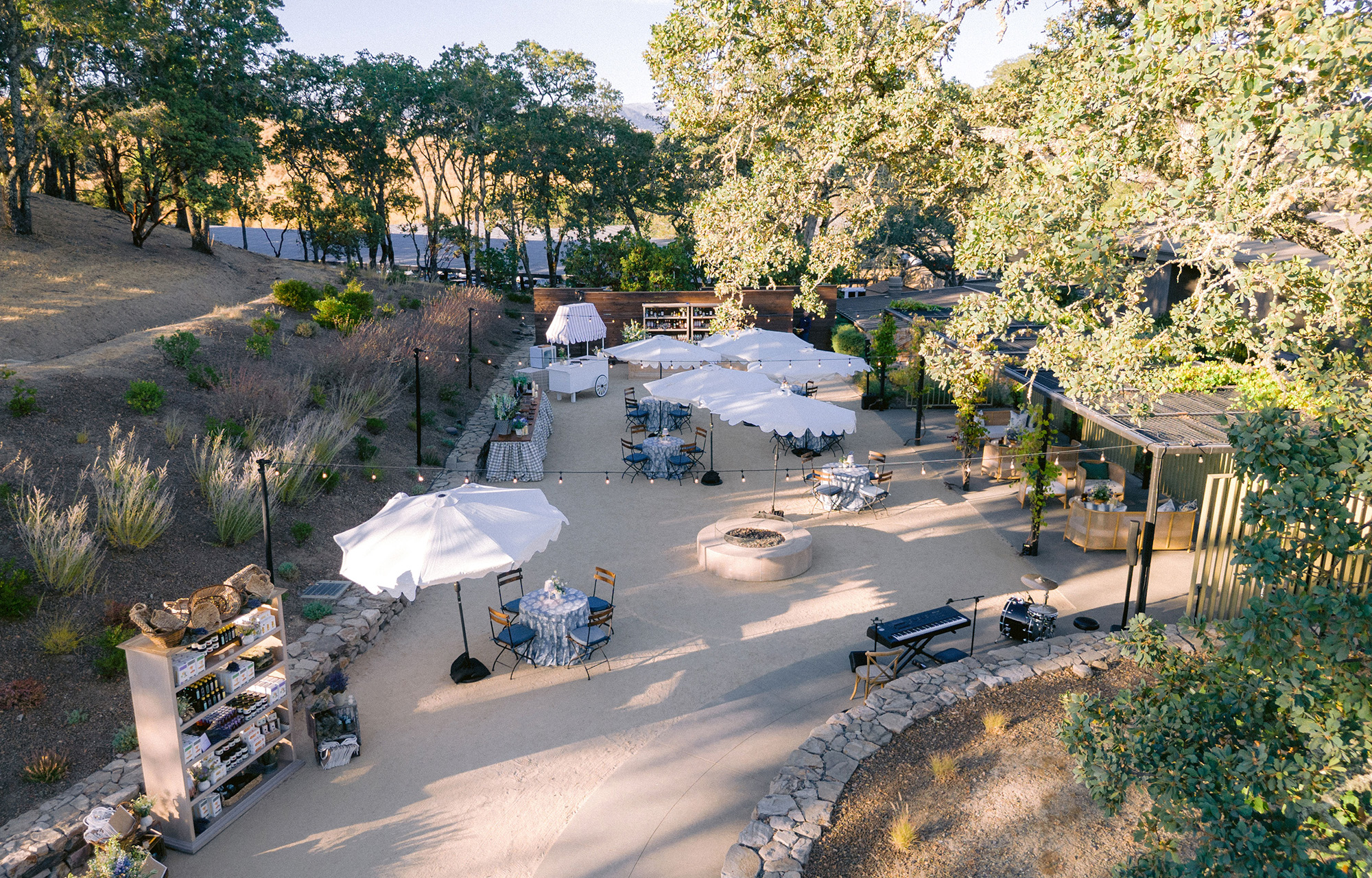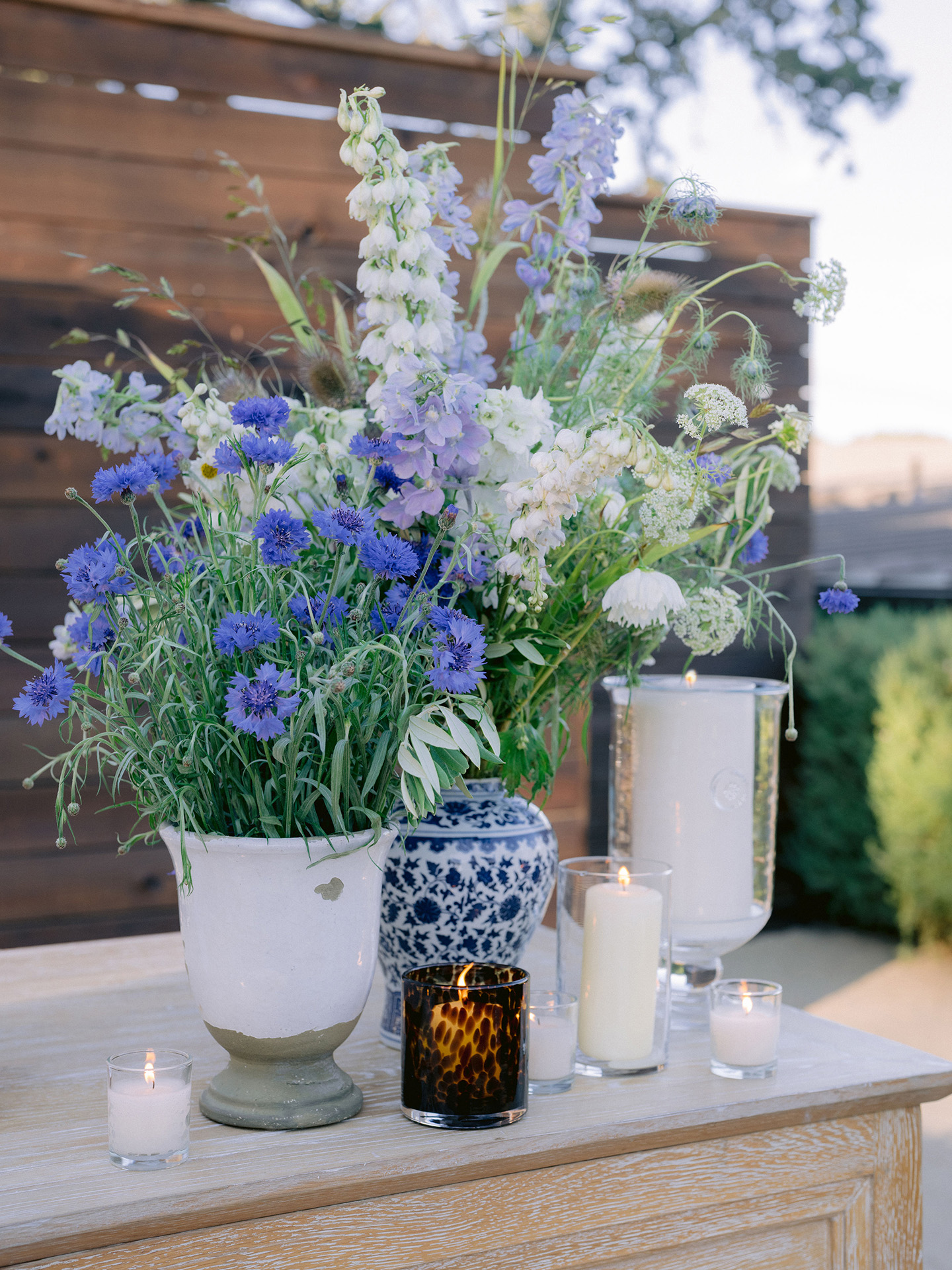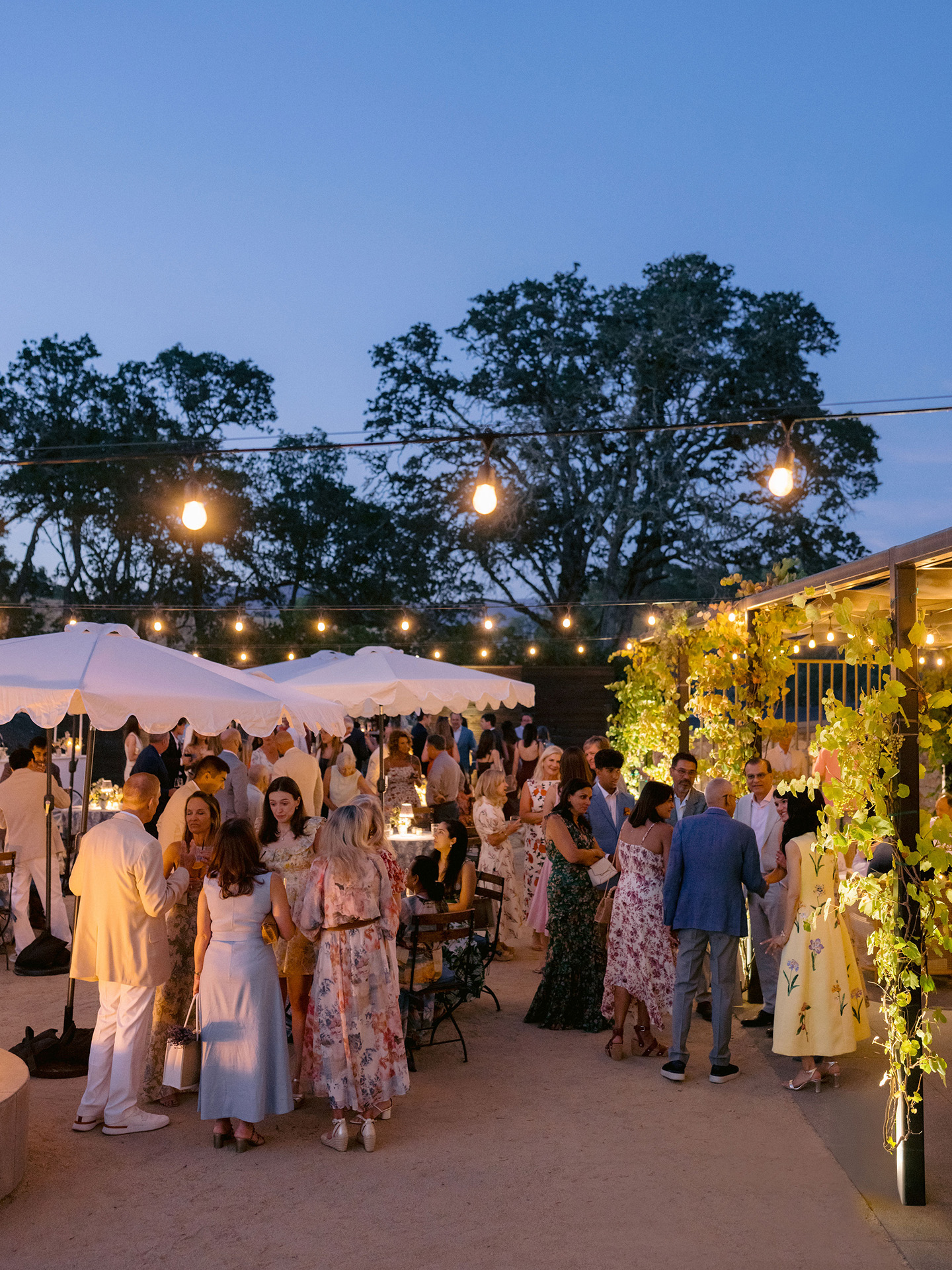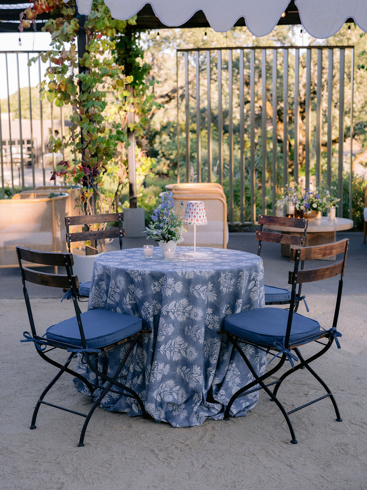 An elegant outdoor soiree under a canopy of market lights, with blue block print linens, checkered table skirts, and wildflower arrangements. Guests enjoyed local treats and lively conversation as the sun set over the oaks, casting a warm Sonoma glow on this welcoming wine country celebration.