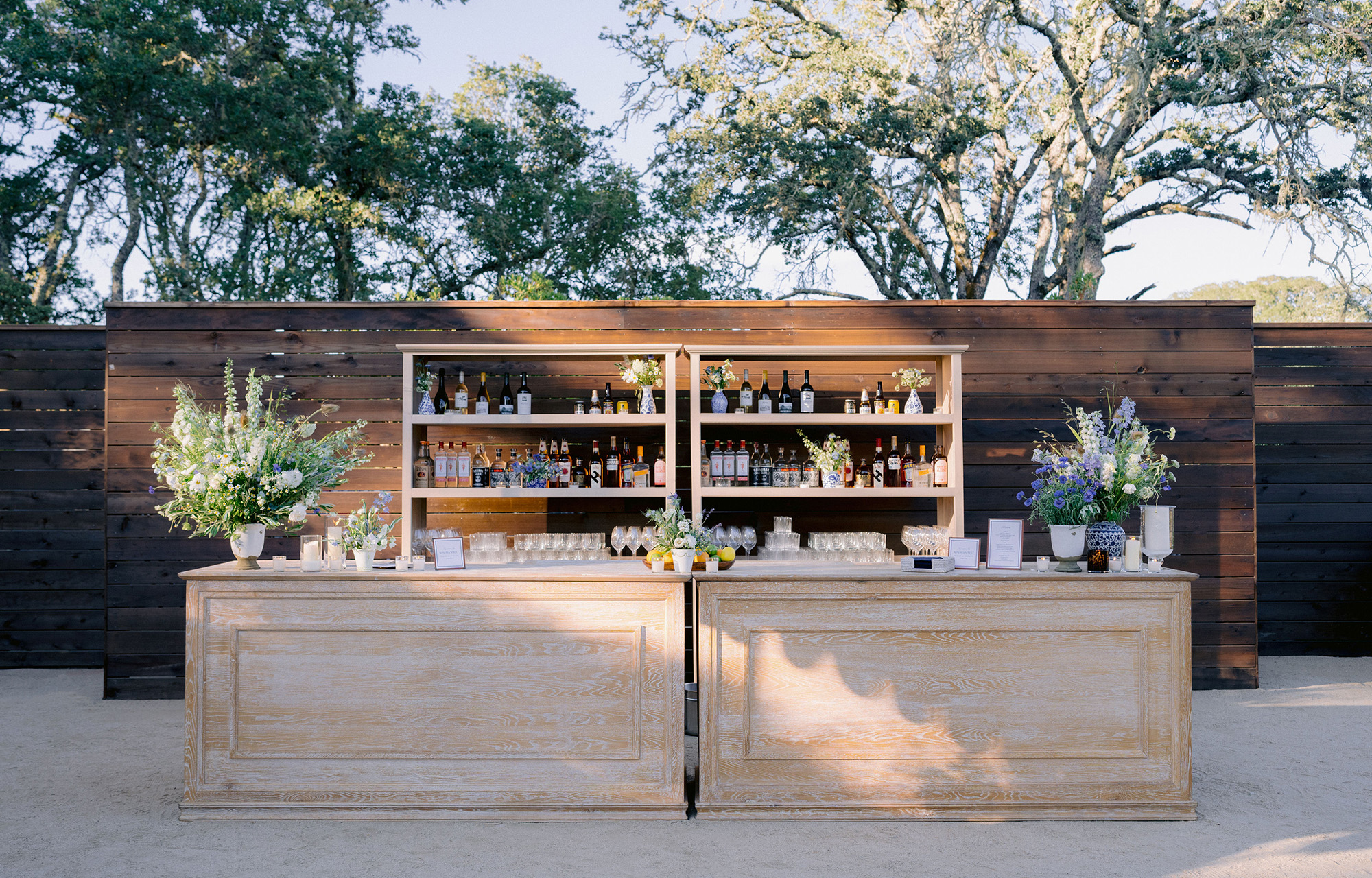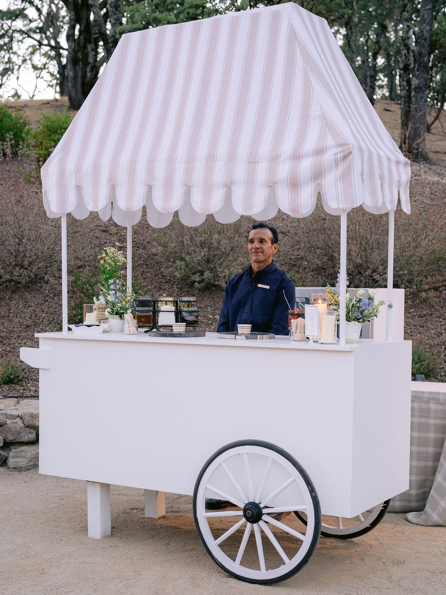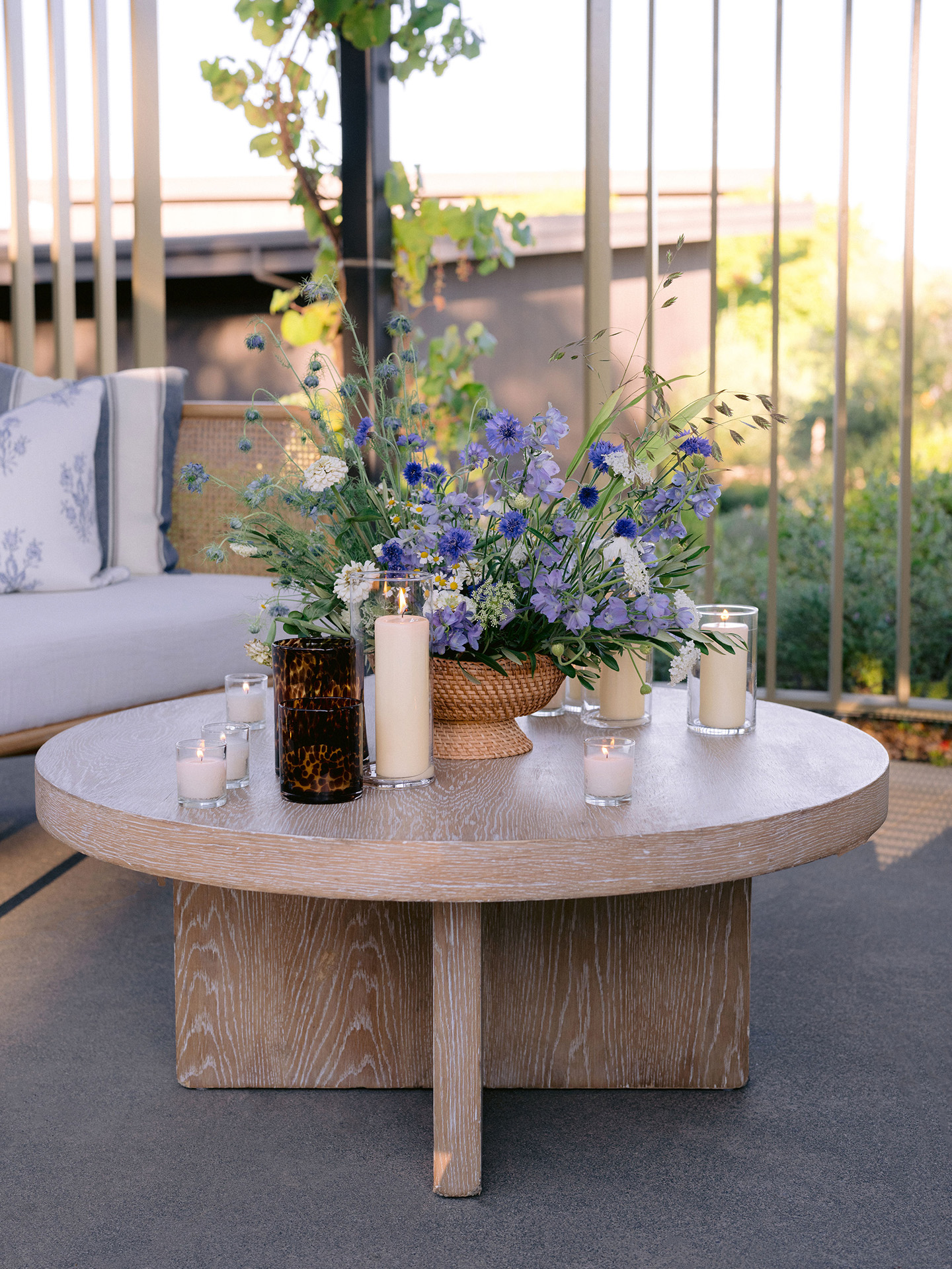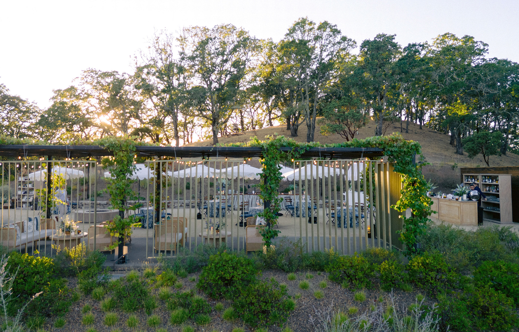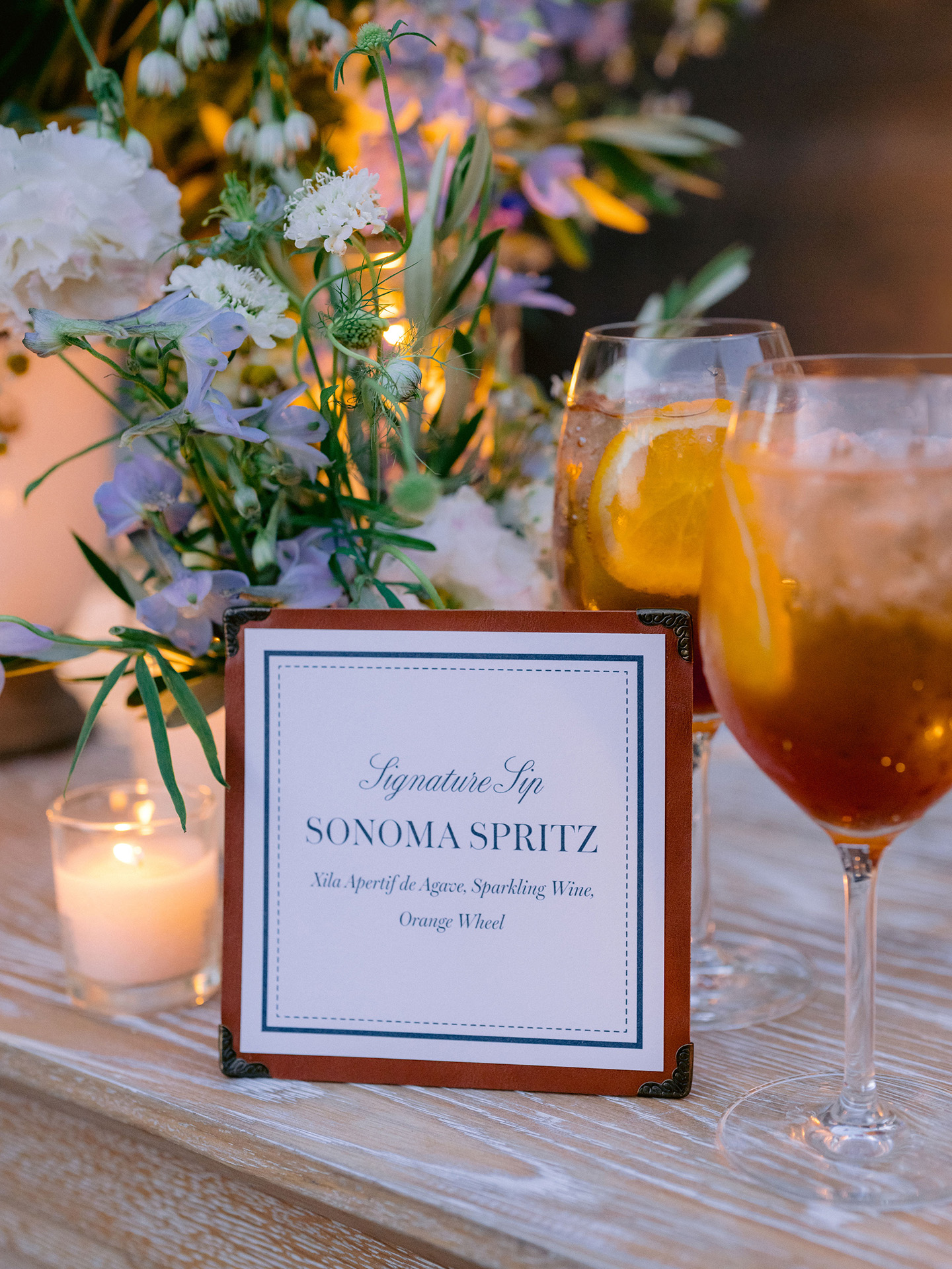 An elegant outdoor soiree under a canopy of market lights, with blue block print linens, checkered table skirts, and wildflower arrangements. Guests enjoyed local treats and lively conversation as the sun set over the oaks, casting a warm Sonoma glow on this welcoming wine country celebration.
