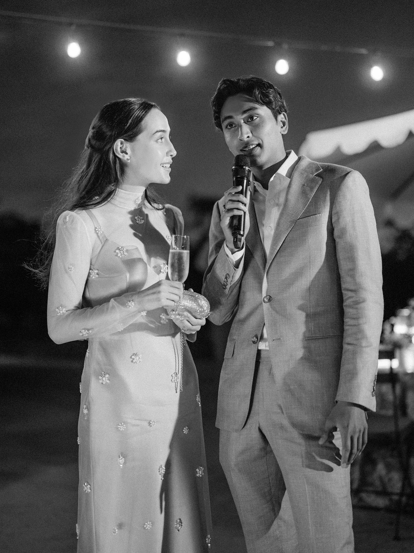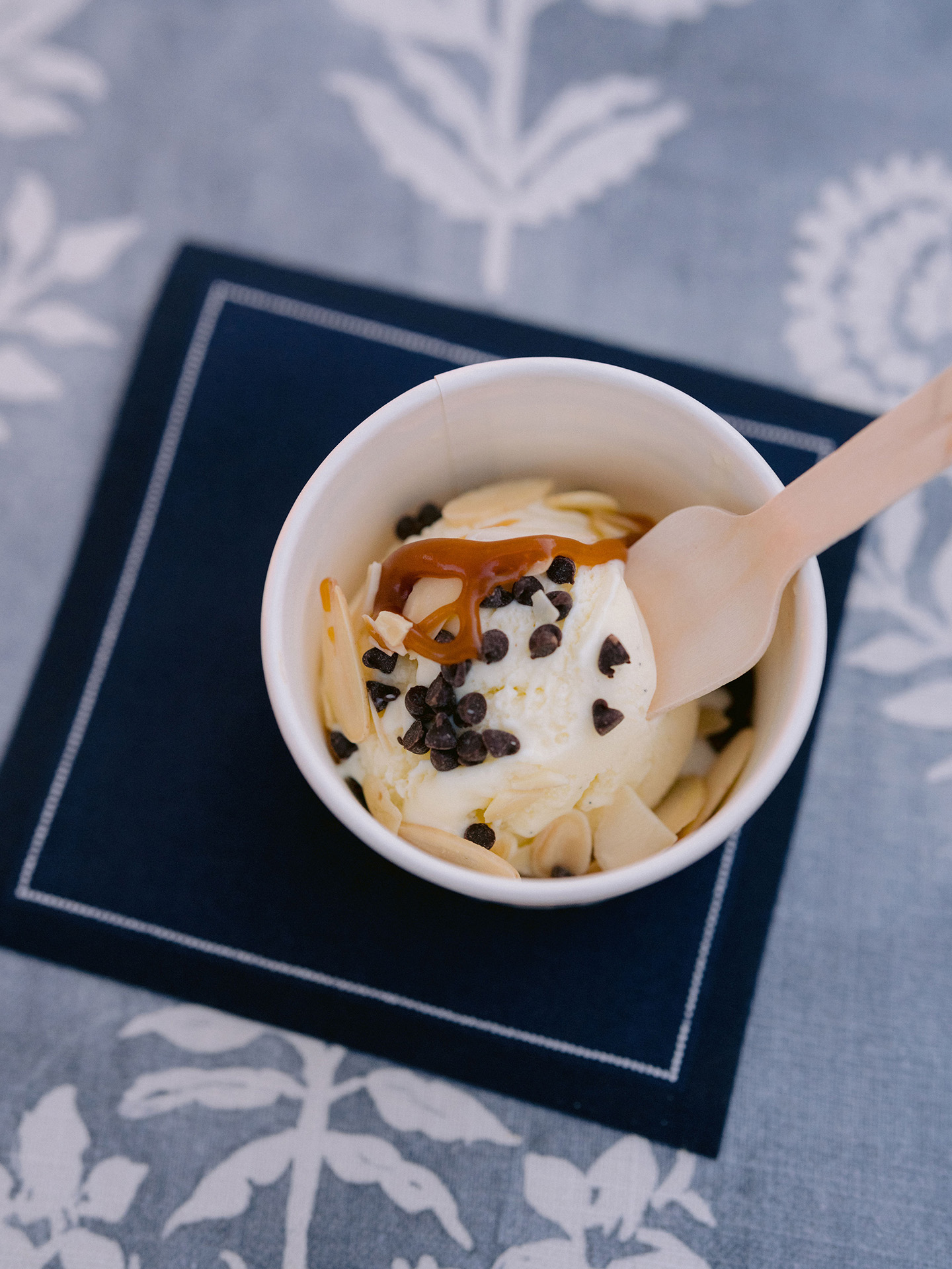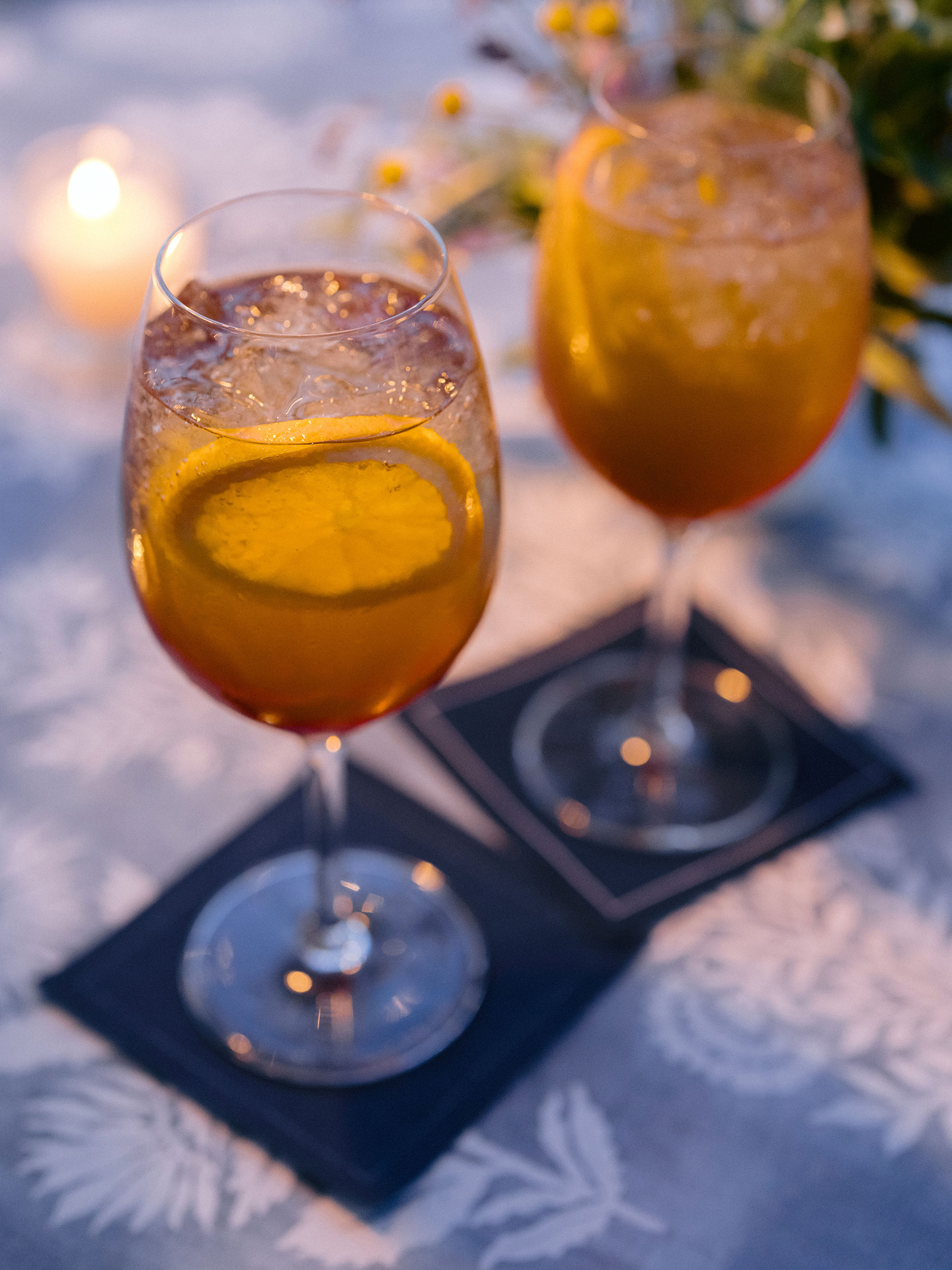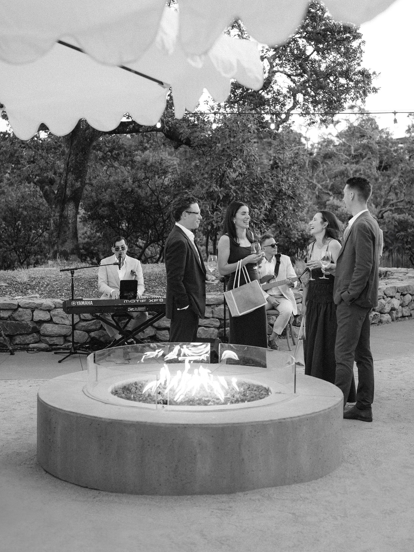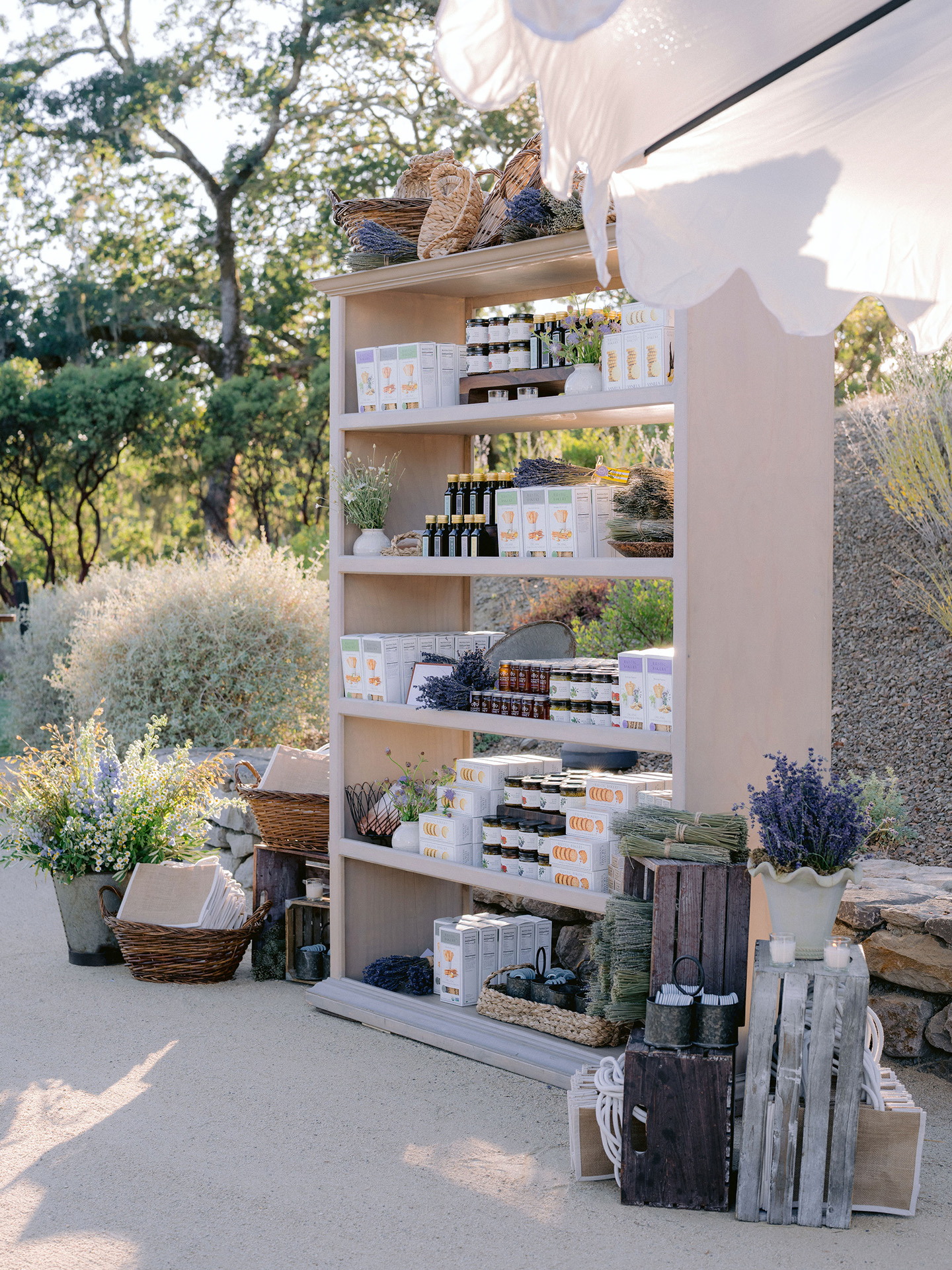 An elegant outdoor soiree under a canopy of market lights, with blue block print linens, checkered table skirts, and wildflower arrangements. Guests enjoyed local treats and lively conversation as the sun set over the oaks, casting a warm Sonoma glow on this welcoming wine country celebration.
